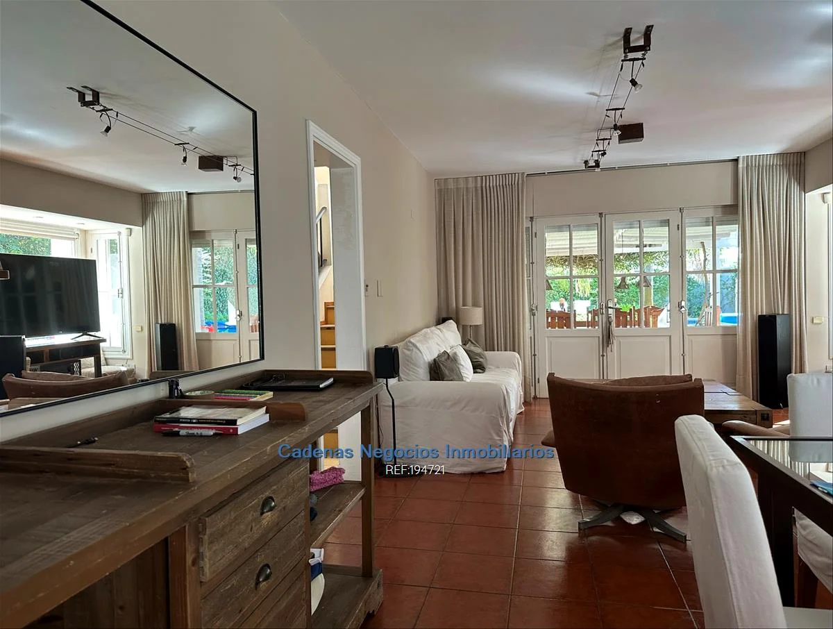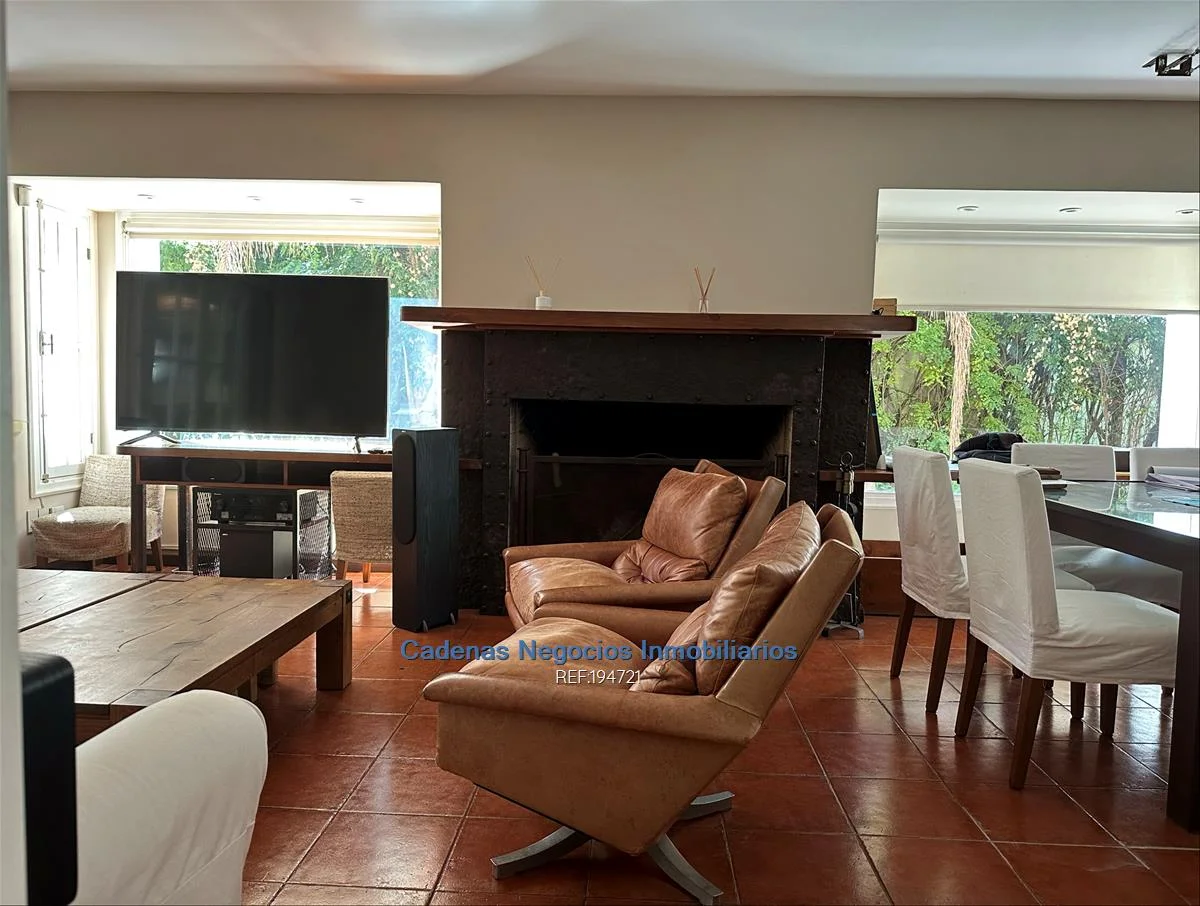 Estar diario con estufa a leña y espacio para comedor diario. El estar se integra mediante puerta ventana a pérgola techada que cuenta con parrillero.