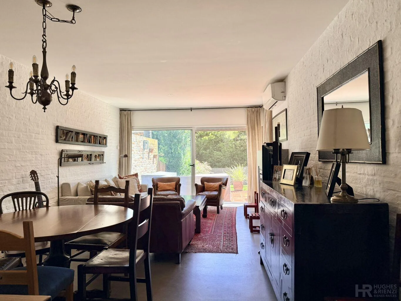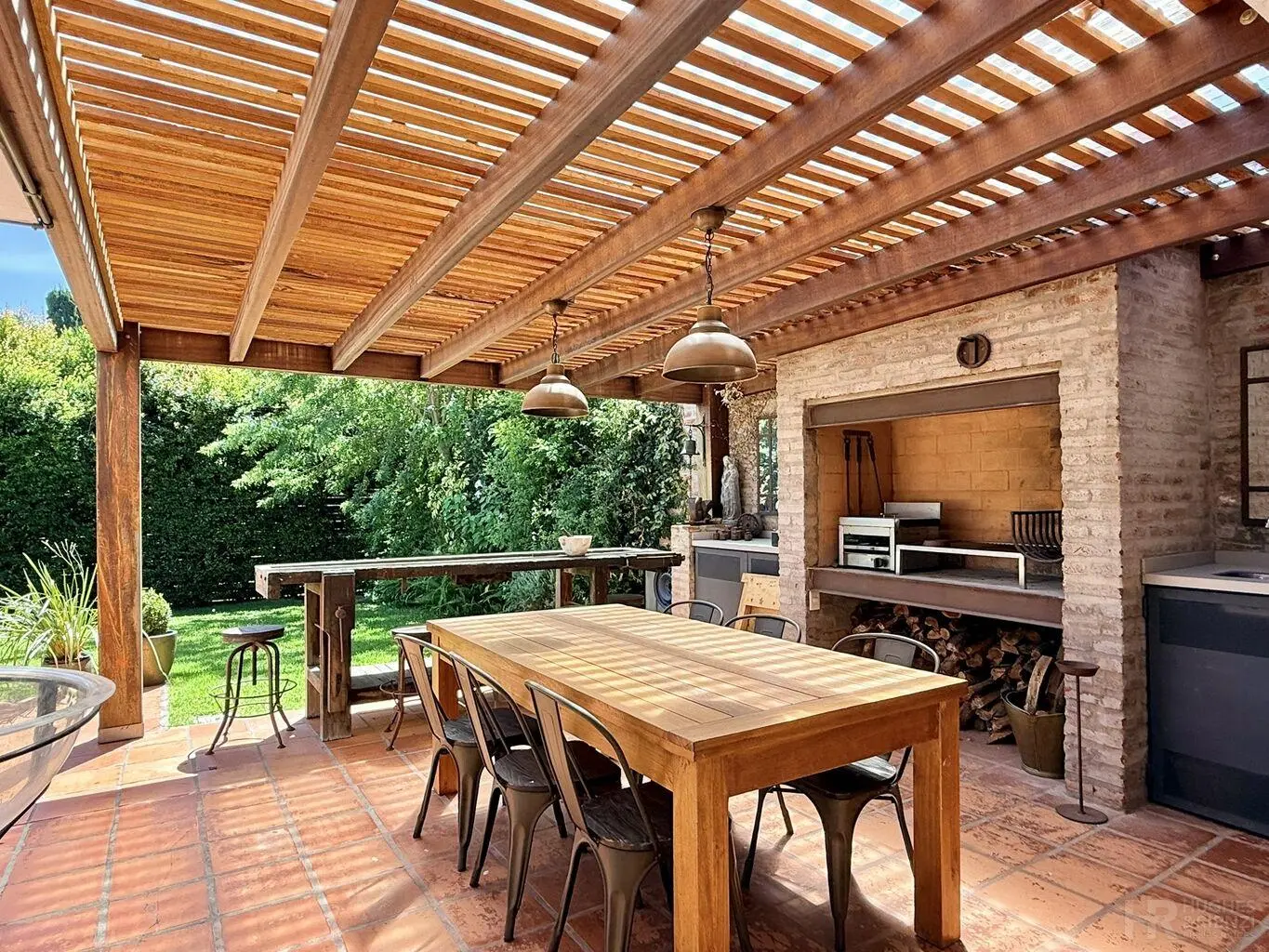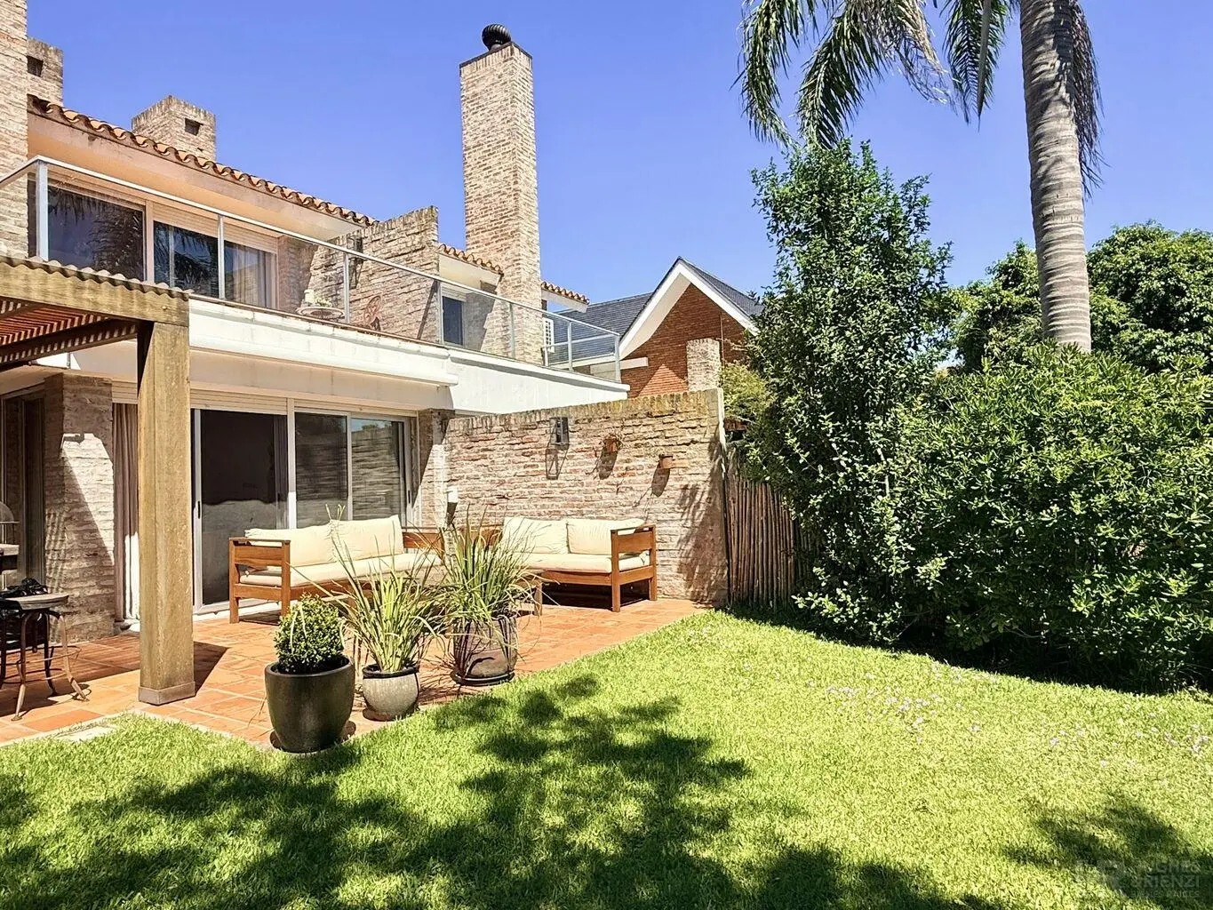 Muy lindo fondo, orientado al norte; con galería pergolada con parrillero, jardín y garaje para un auto.