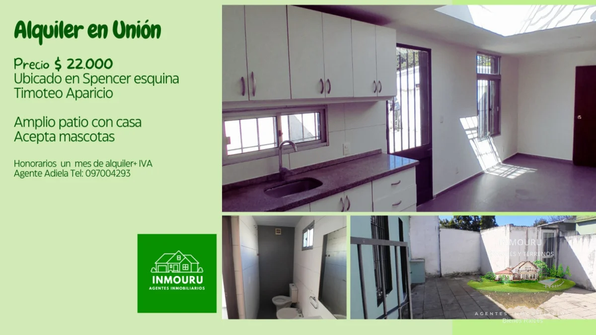 Hermoso apartamento en alquiler en zona Unión, en Spencer equina Timoteo Aparicio. Ambientes grandes muy iluminados. Cuenta con 2 dormitorios, cocina integrada, baño, amplio patio. Con buena locomoción.