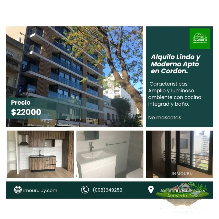 Alquilo lindo y Moderno Monoambiente ubicado en Cordón en la calle José Enrique Rodo a pasos de Bulevar Artigas, ambiente muy luminoso en el 7 piso, Cuenta con cocina integrada, placares bajo mesada y aéreos, campana extractora, equipo de aire acondicionado, placard extra que incluye calefón instalado y conexión para lavarropas. baño completo y área de lavandería, gimnasio y piscina con su parilla. No se aceptan mascotas.