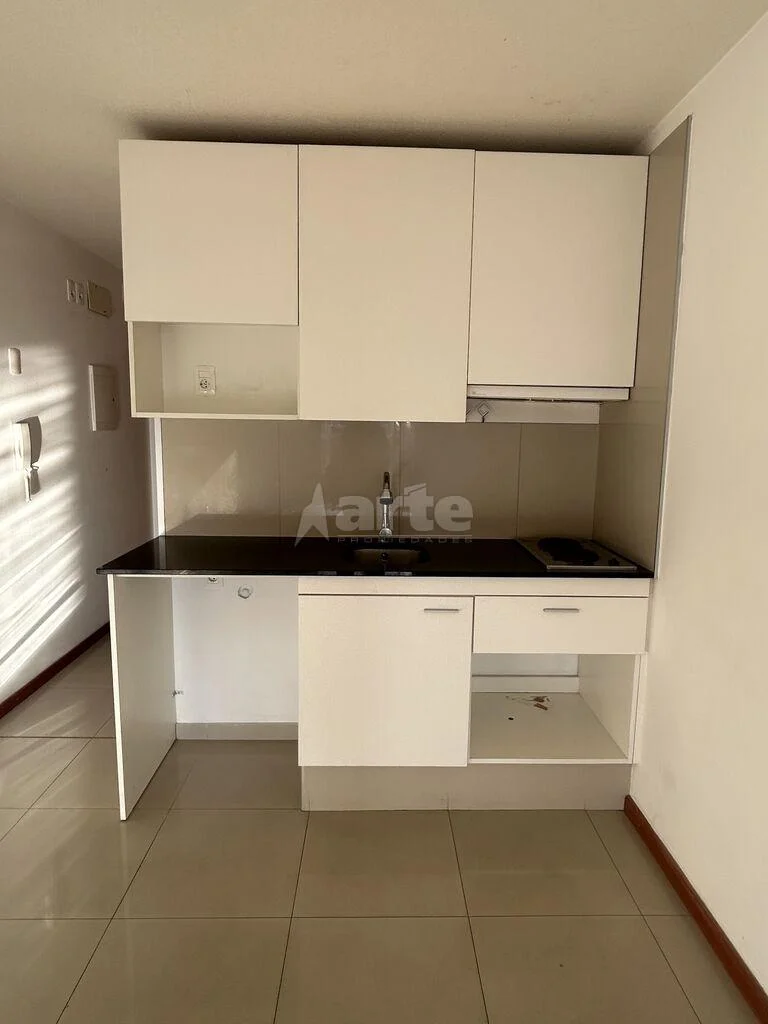 Cocina integrada y baño completo con mampara de vidrio, calefón instalado y conexión para lavarropas.