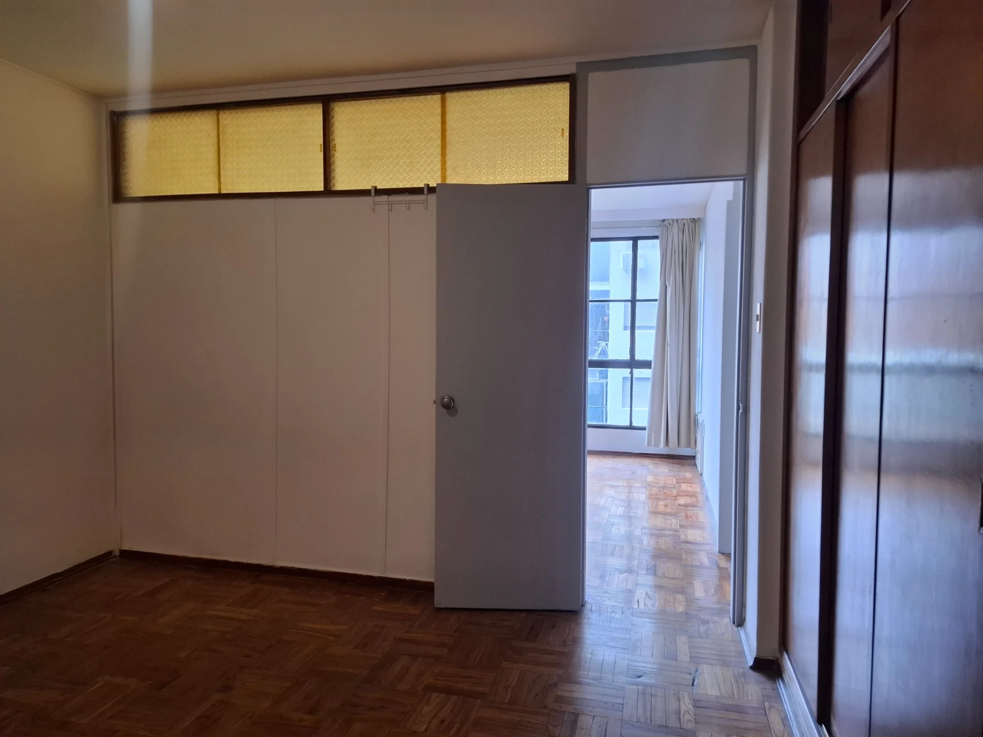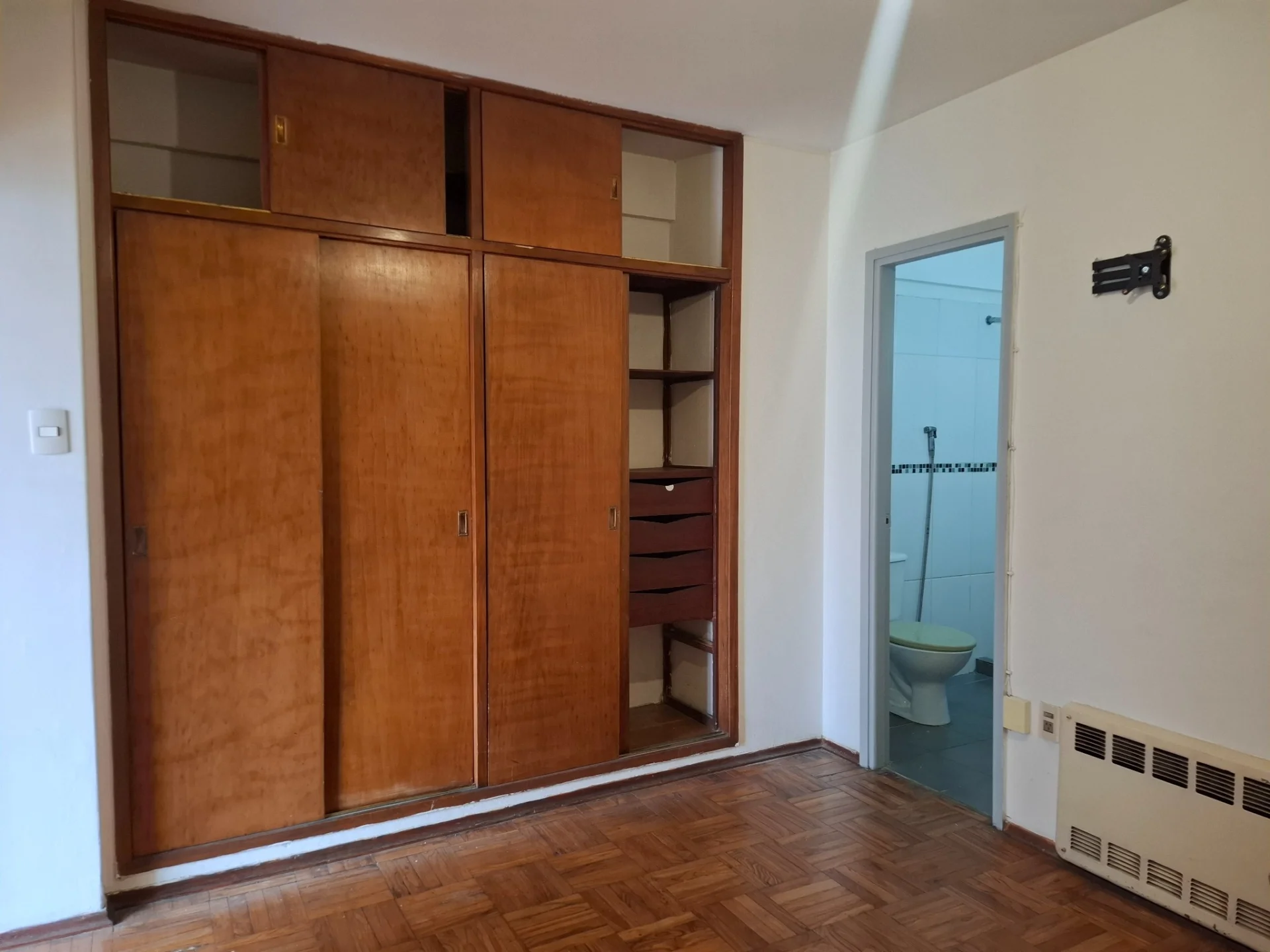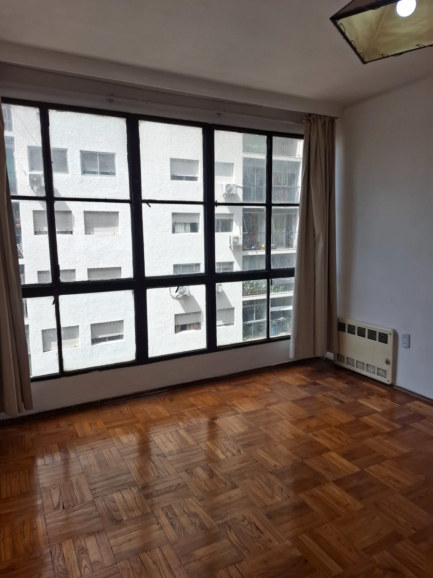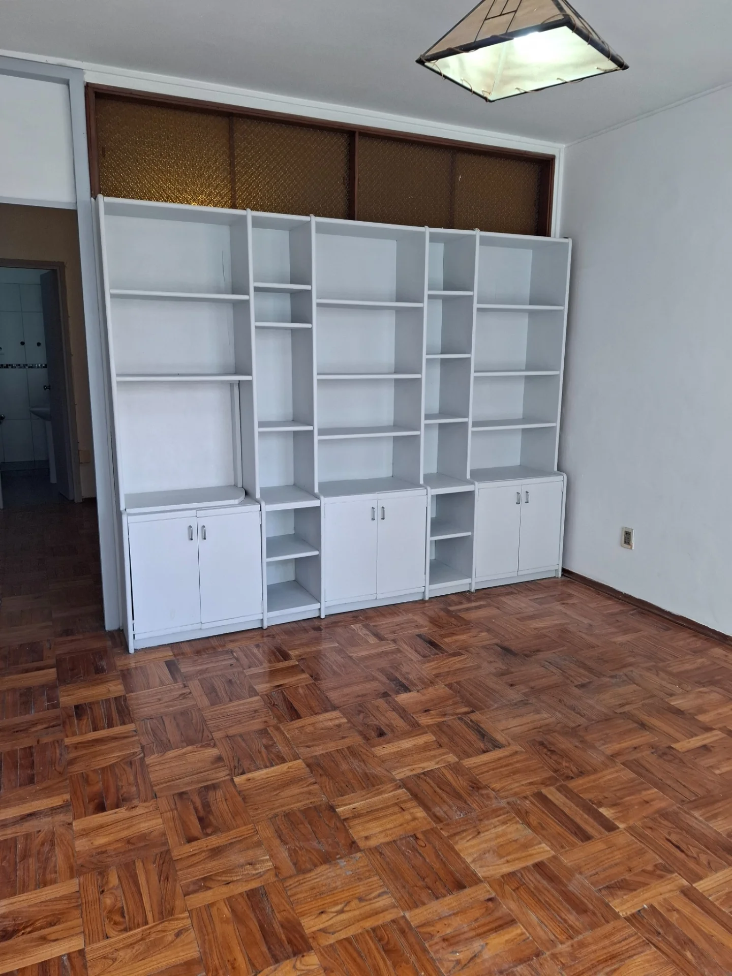 LIVING CON VENTANAL , BIBILOTECA MADERA BLANCA, PISOS DE PARQUET AL IGUAL QUE DORMITORIO CON PLACARD EMPOTRADO.