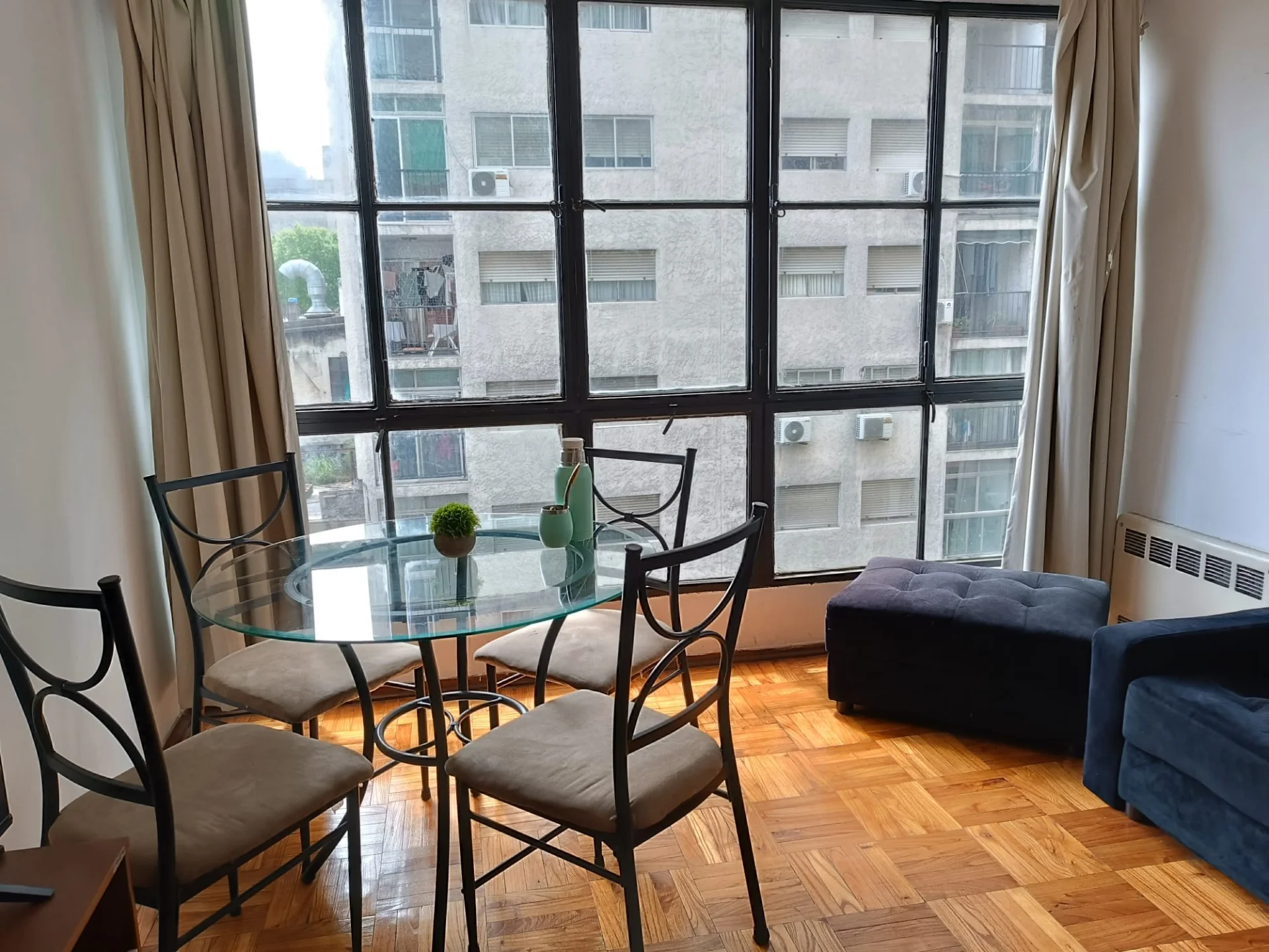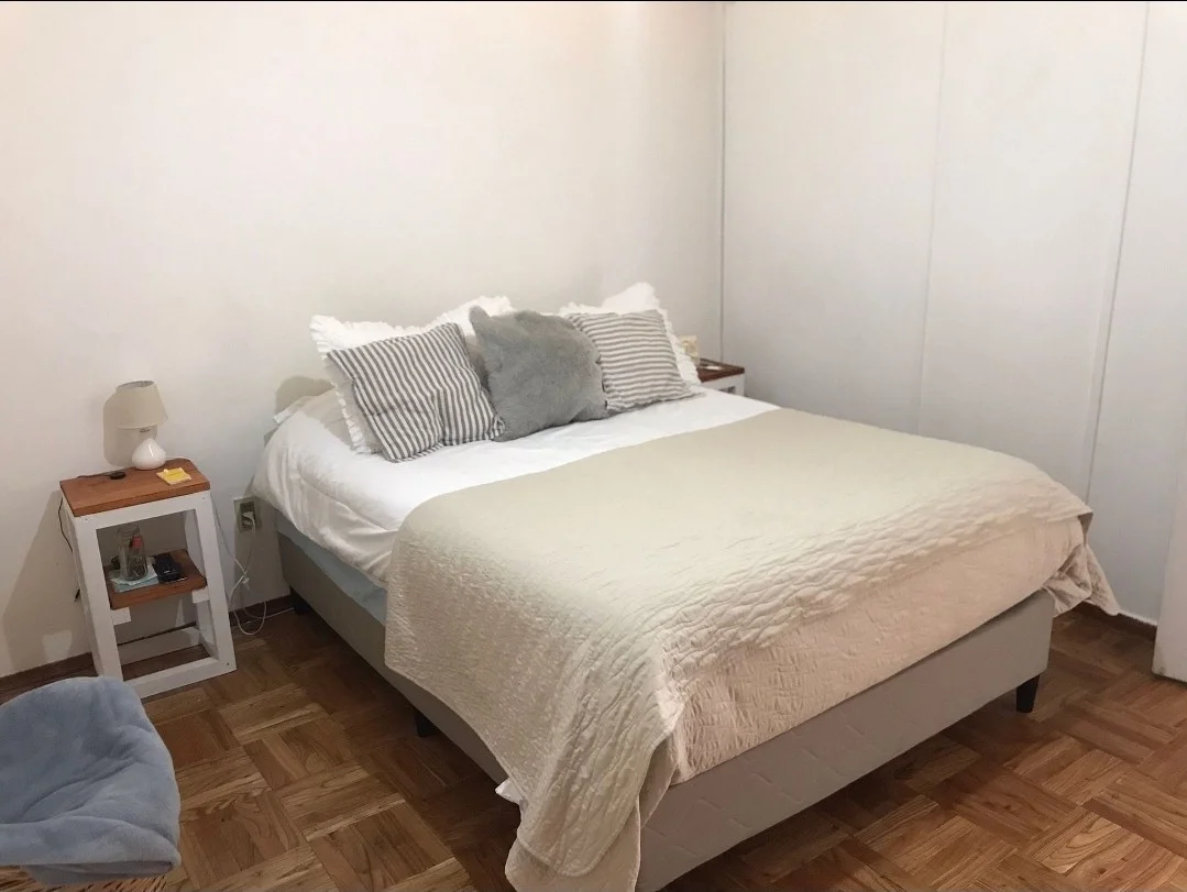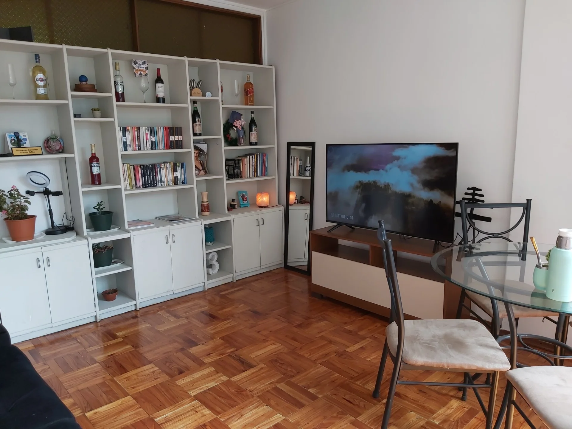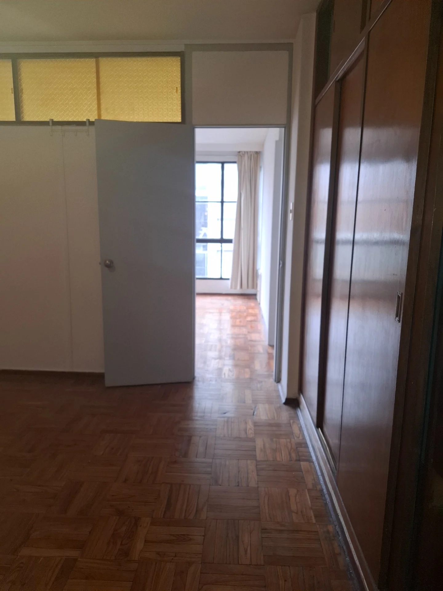 LIVING CON VENTANAL , BIBILOTECA MADERA BLANCA, PISOS DE PARQUET AL IGUAL QUE DORMITORIO CON PLACARD EMPOTRADO.