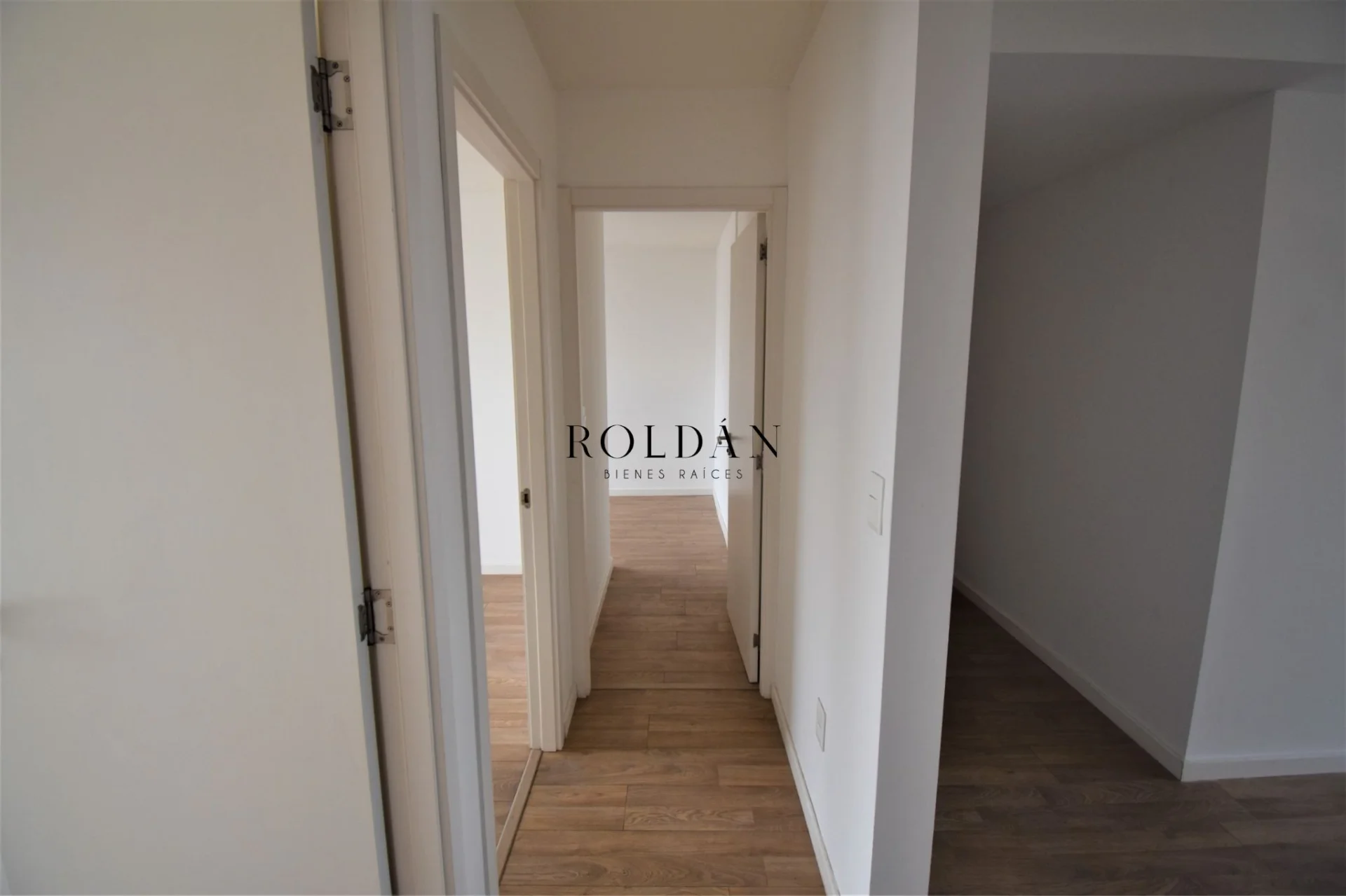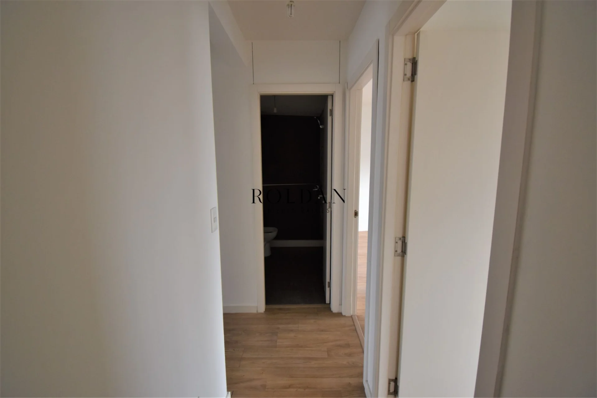 Pasillo de distribución que permite acceso a los tres dormitorios al contrafrente con ventanas con persianas y vistas a Av. 18 de Julio, baño completo con gran espejo.