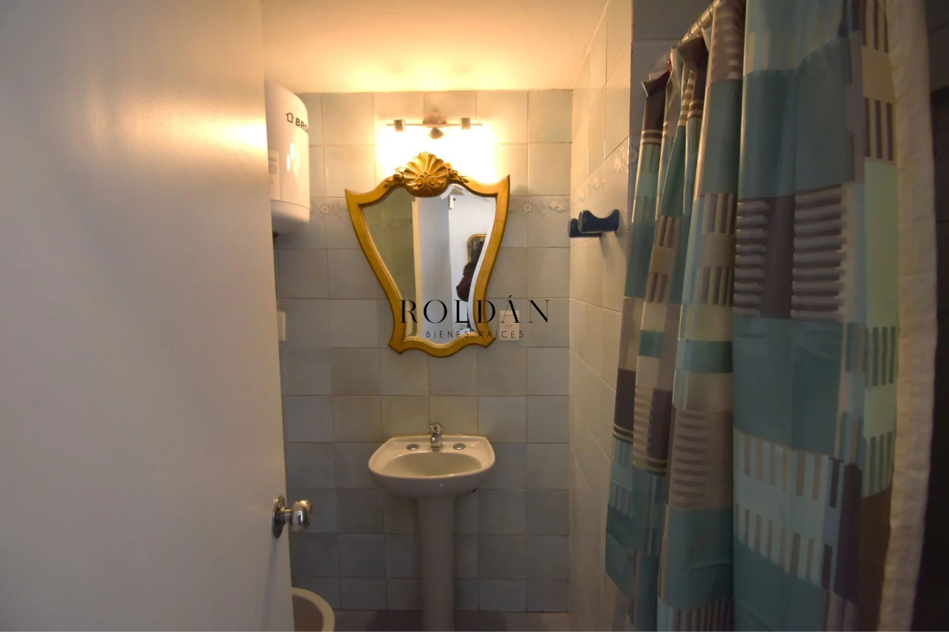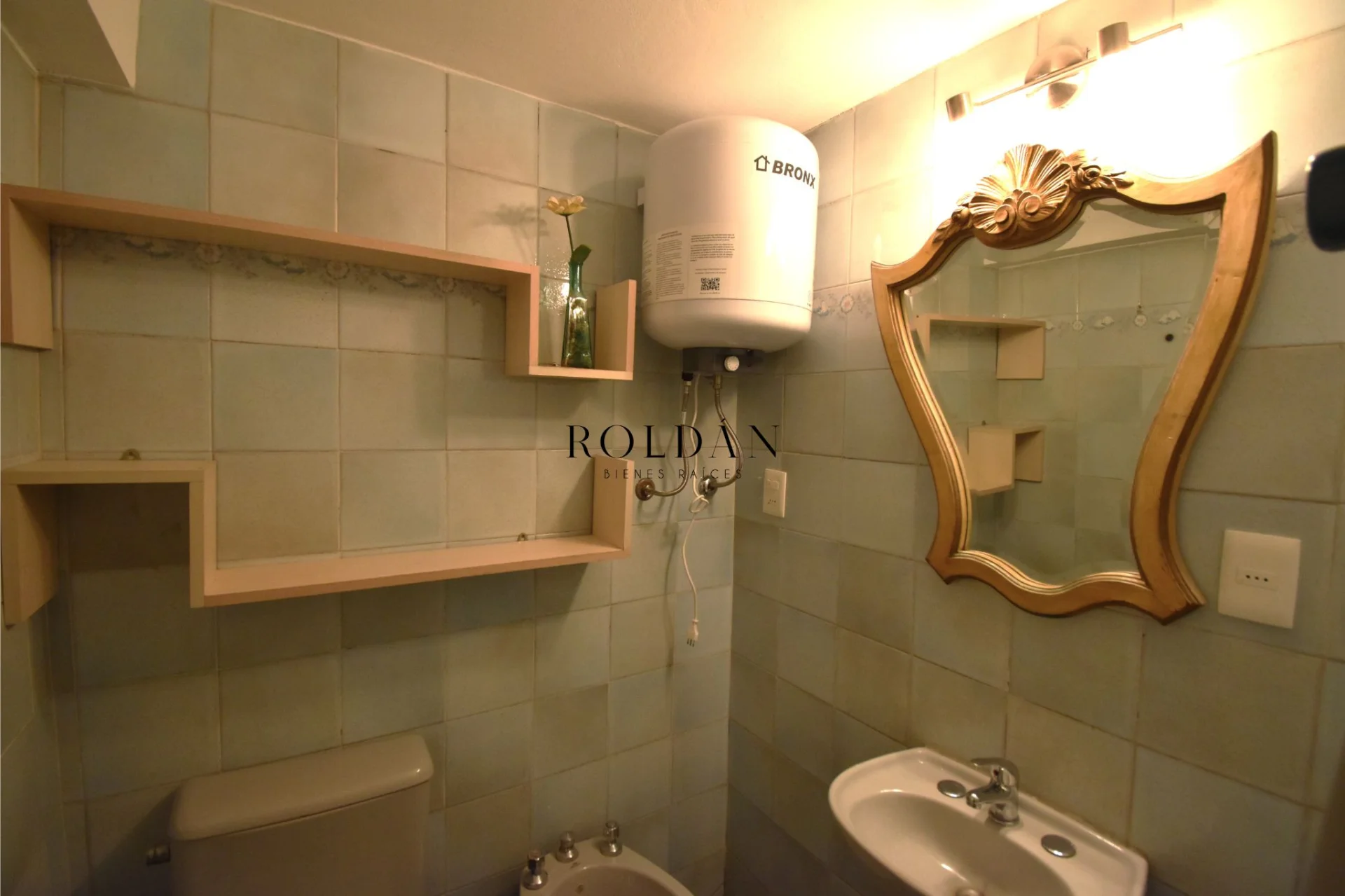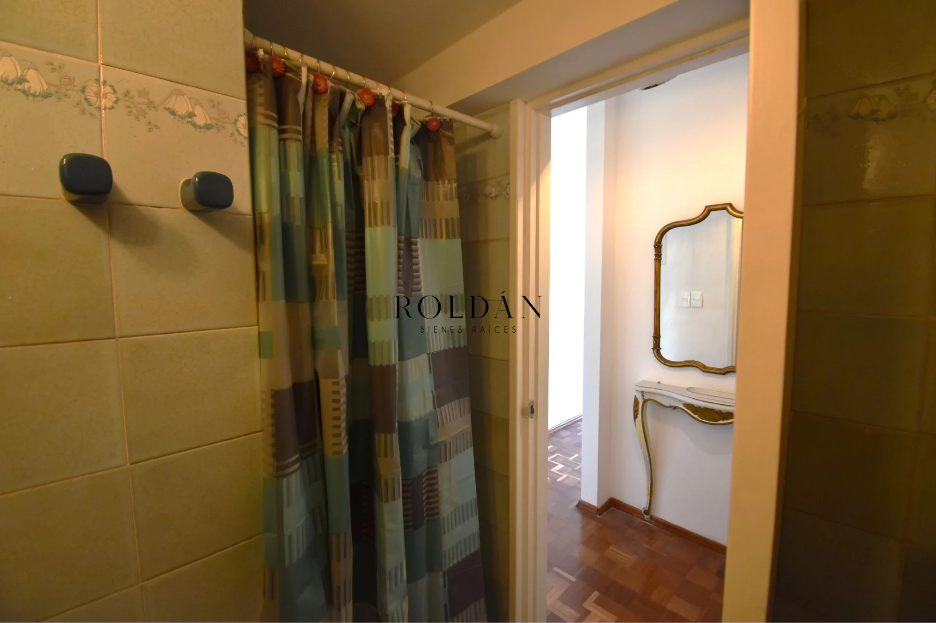 Pasillo de distribución con mueble empotrado, dormitorio también al frente con techo alto, ventana con persiana y piso de parquet, baño completo con calefón y espejo.