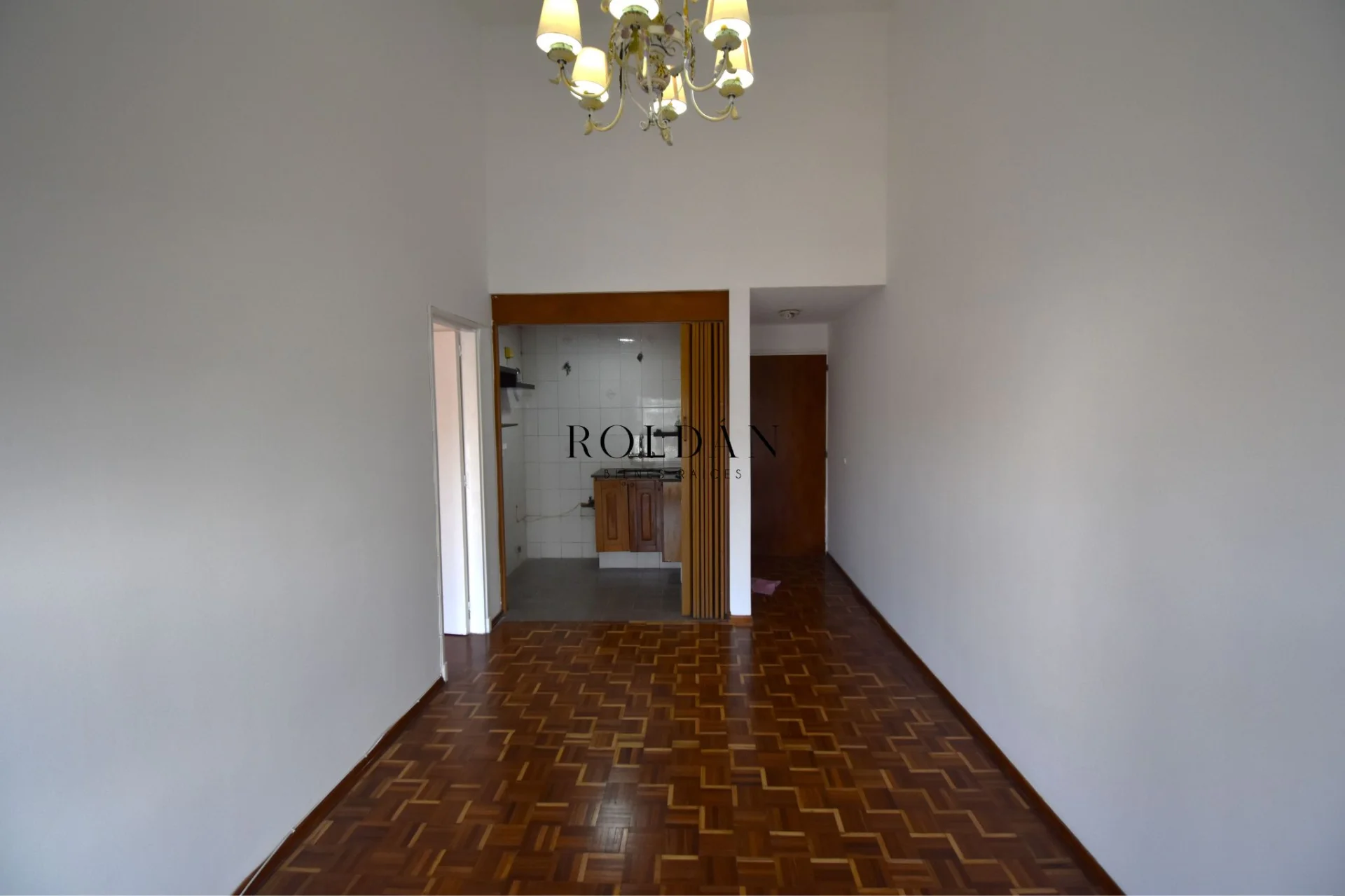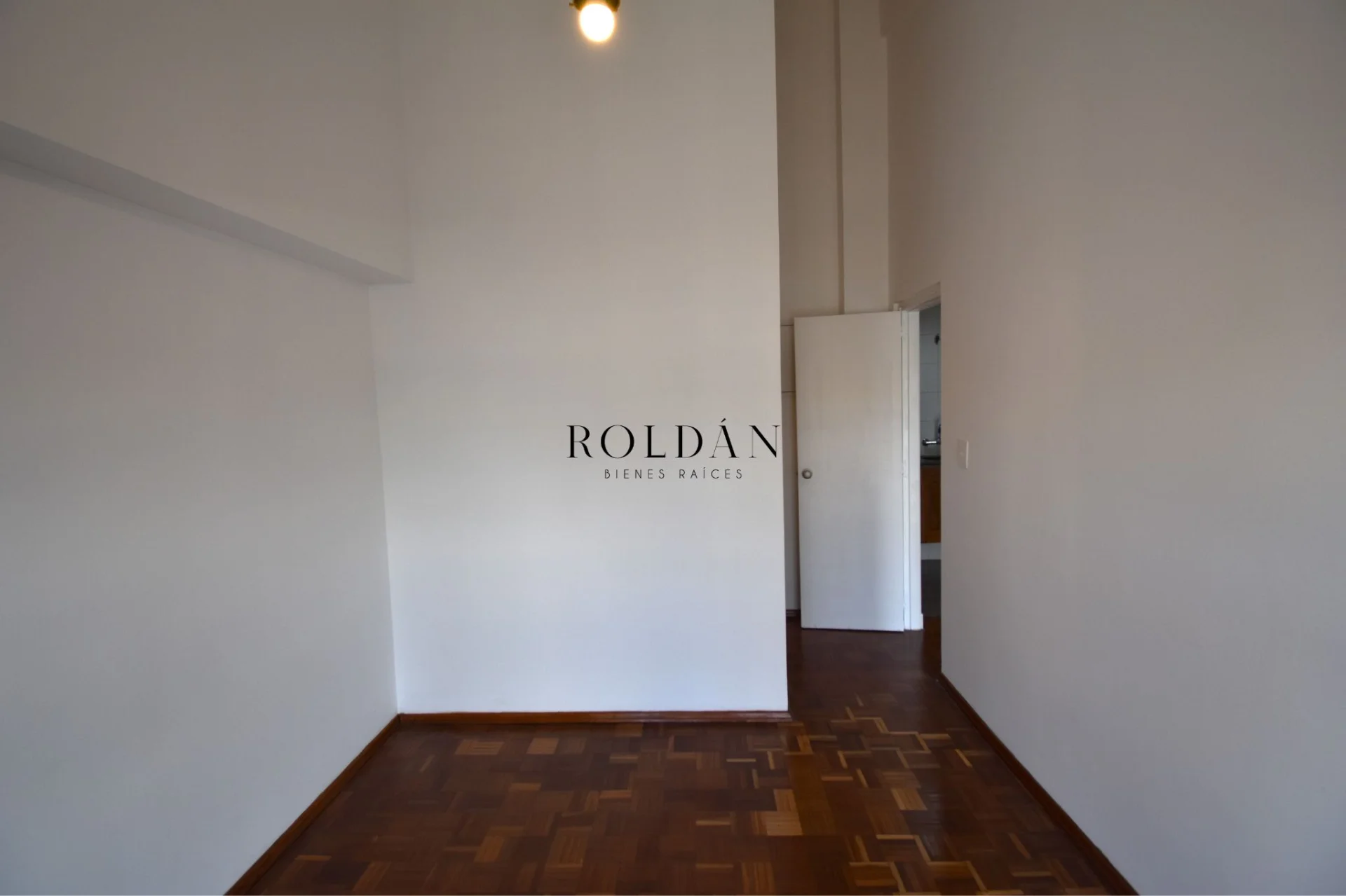 Living comedor al frente con amplia ventana con persiana, techos altos y piso de parquet, cocina semi definida con puerta plegable y mueble aéreo y bajo mesada.