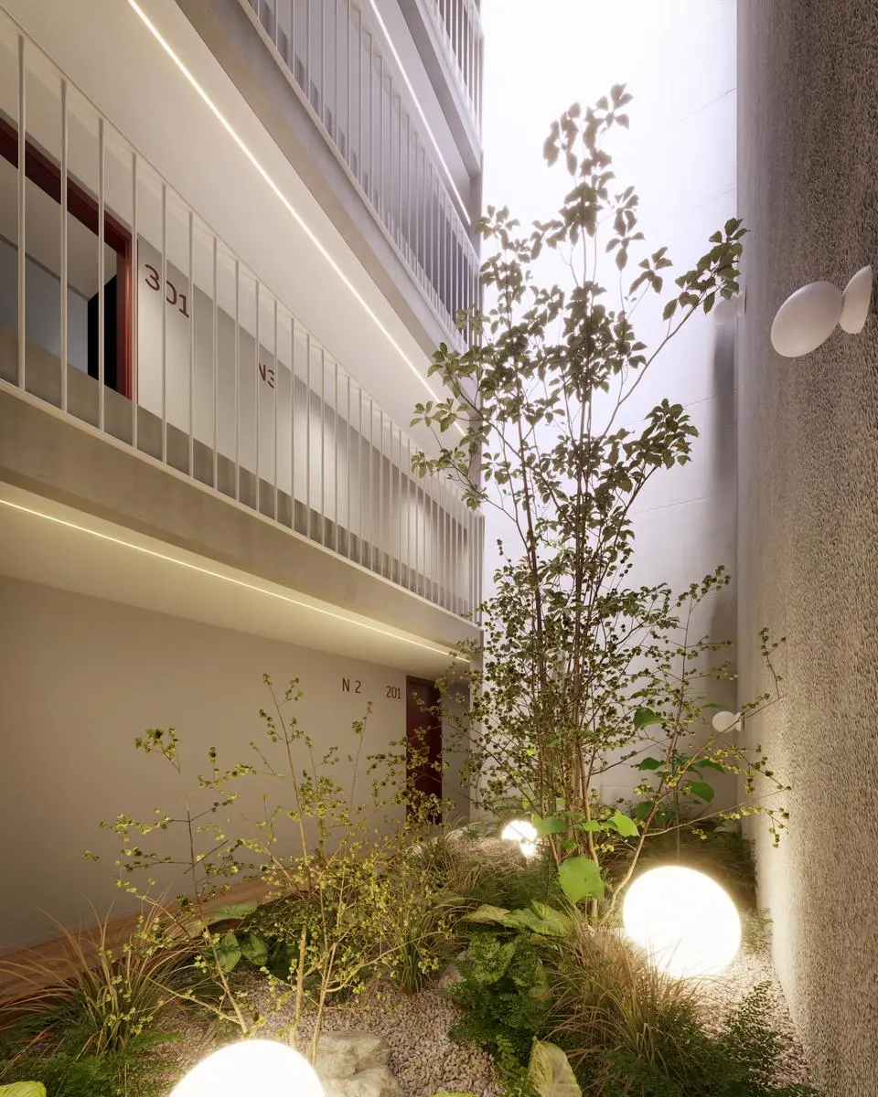 Los pasillos de acceso a las unidades en todos los pisos reciben luz natural, creando espacios más cálidos y acogedores.