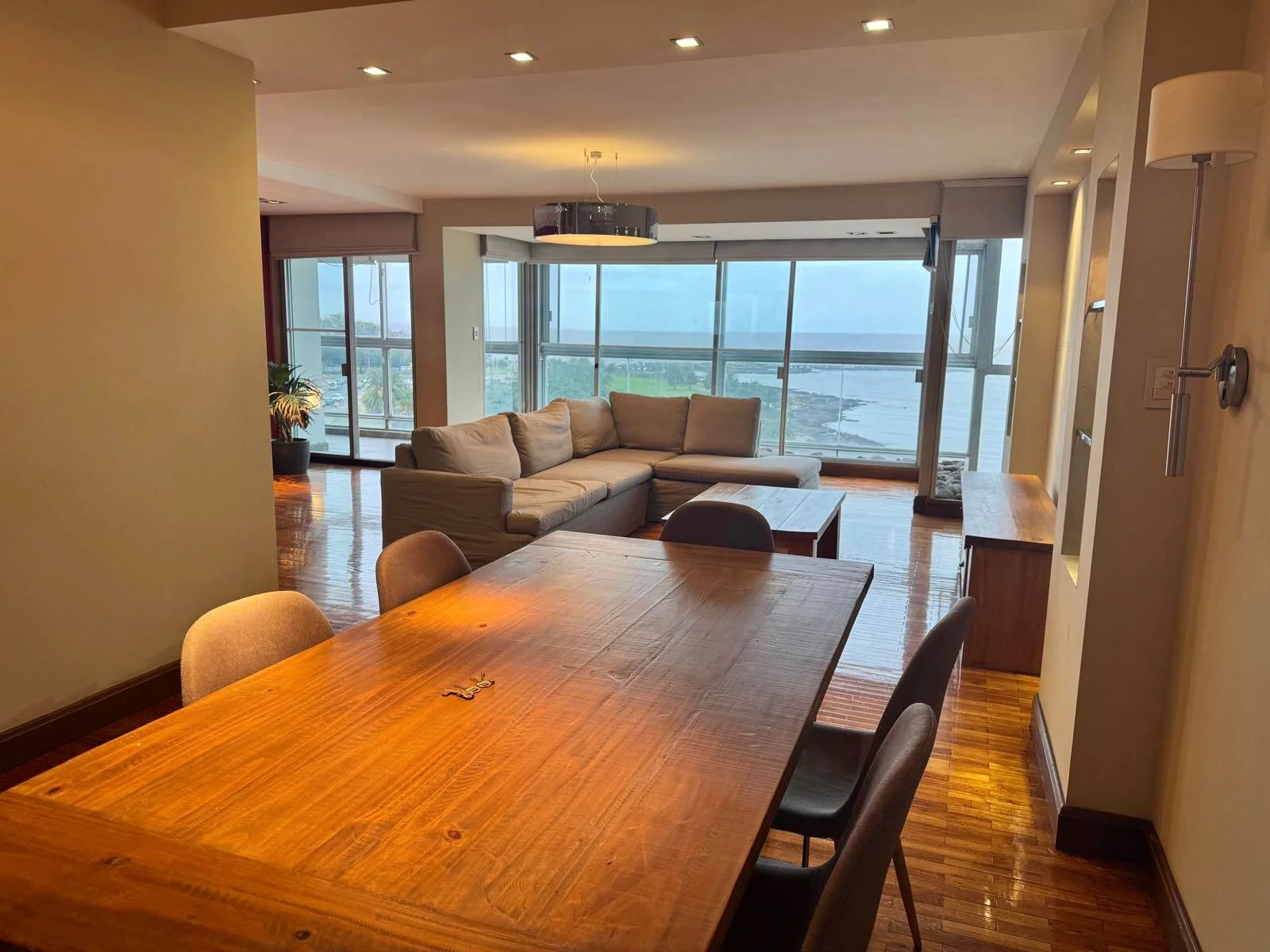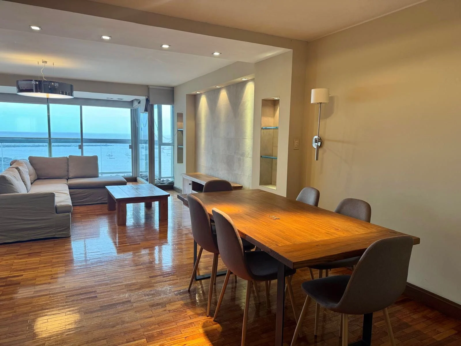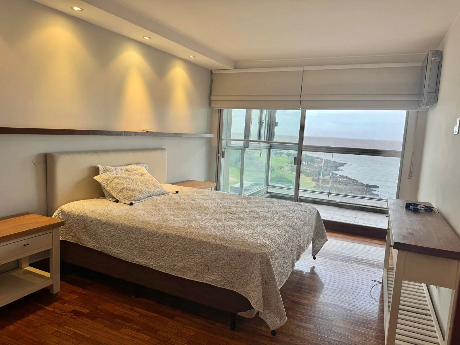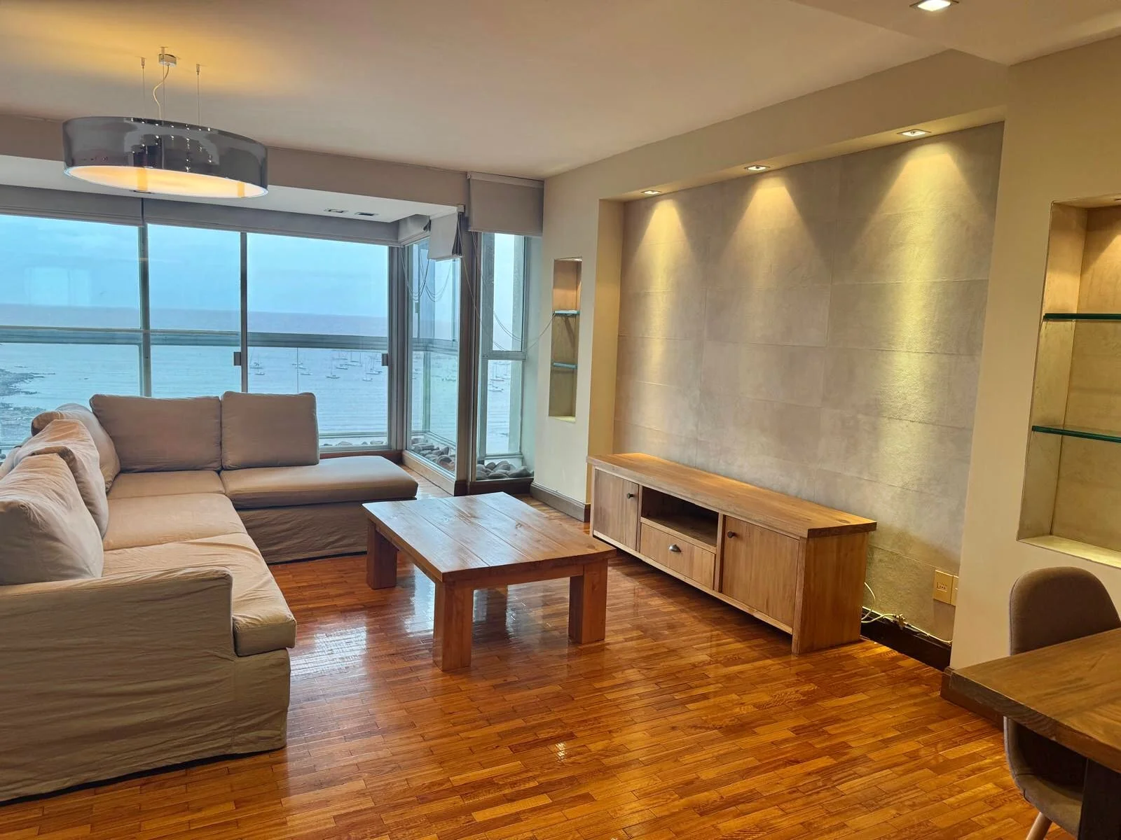Apartamento de categoría. Al ingresar nos encontramos con un amplio living comedor con estufa a leña, el cual tiene amplios ventanales que otorgan una vista despejada hacía el mar y salida a una terraza cerrada, baño social, estar, cocina con office, lavadero y dormitorio de servicio completo.