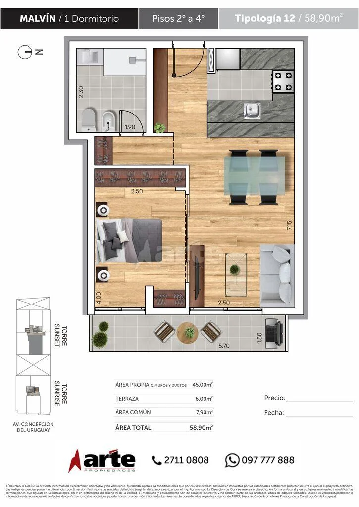Divino apartamento de un dormitorio con amplia terraza en la mejor zona de Malvín. Living y dormitorio con salida a la terraza y cocina integrada con amplia mesada y barra divisora, equipada con horno, anafe y campana. En un moderno edificio, sobre Concepción del Uruguay, que se estrena en invierno de 2025 y contará con gimnasio, lavadero, área de cowork y parrilleros de uso común.