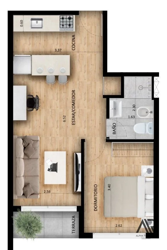 Consta de un estar comedor con cocina integrada, 1 dormitorio y 1 baño completo.
