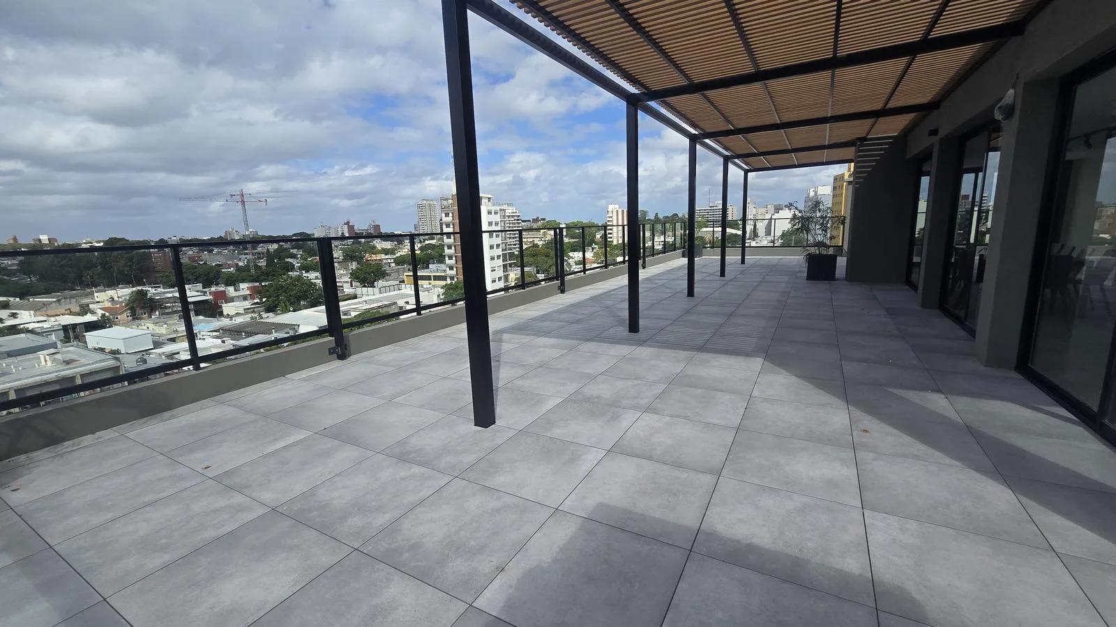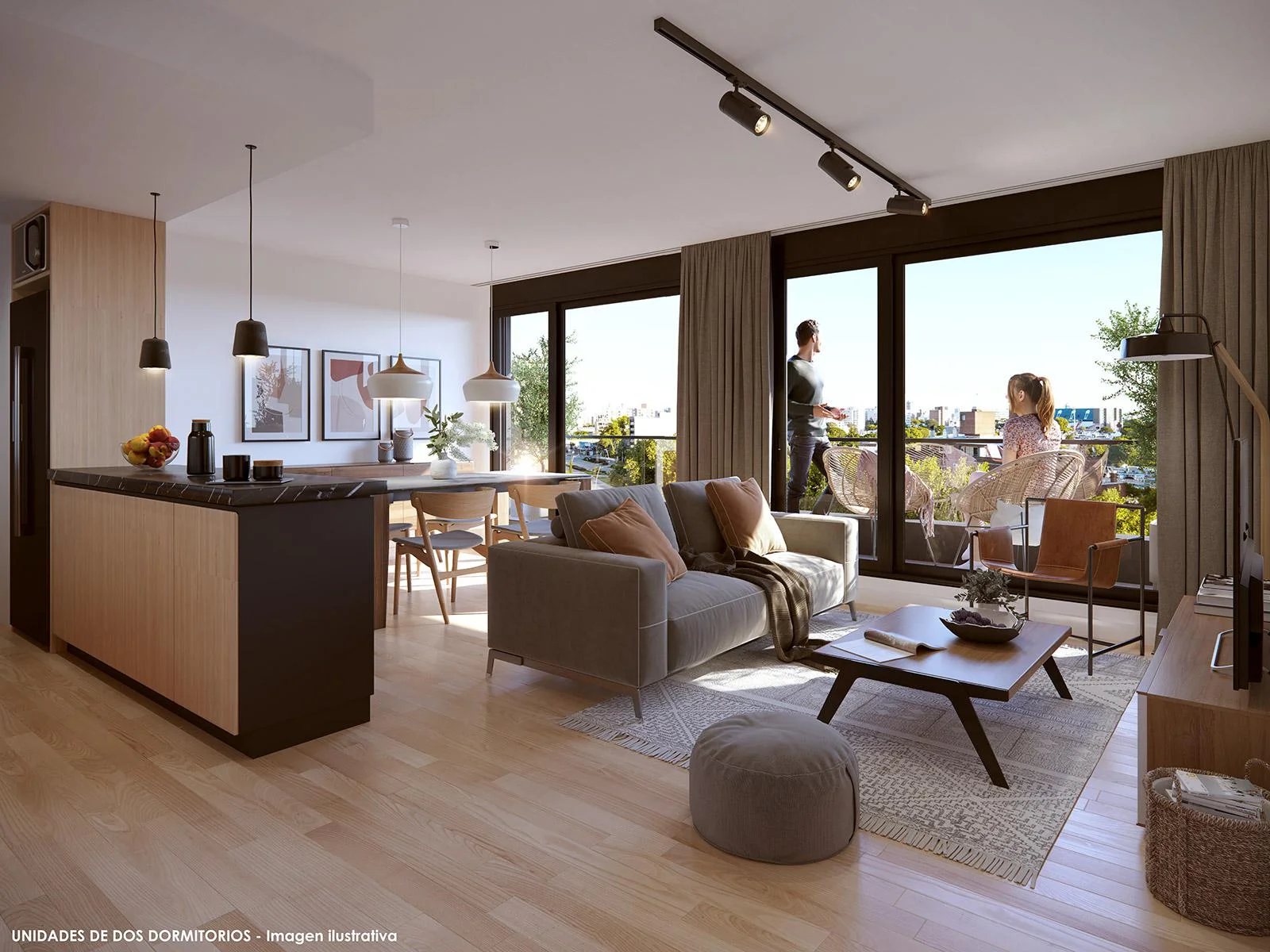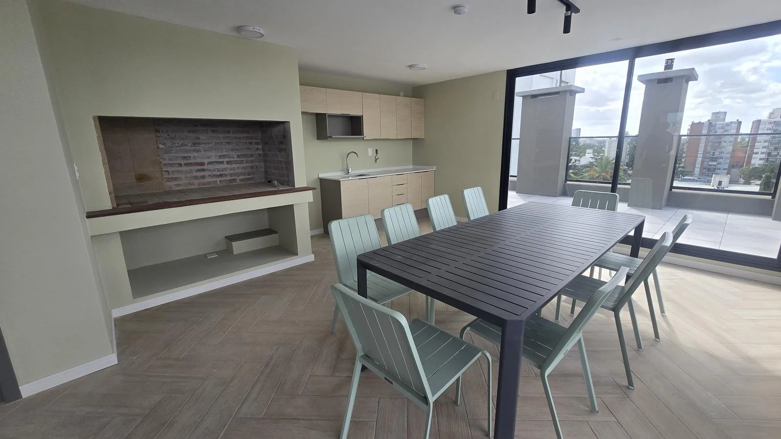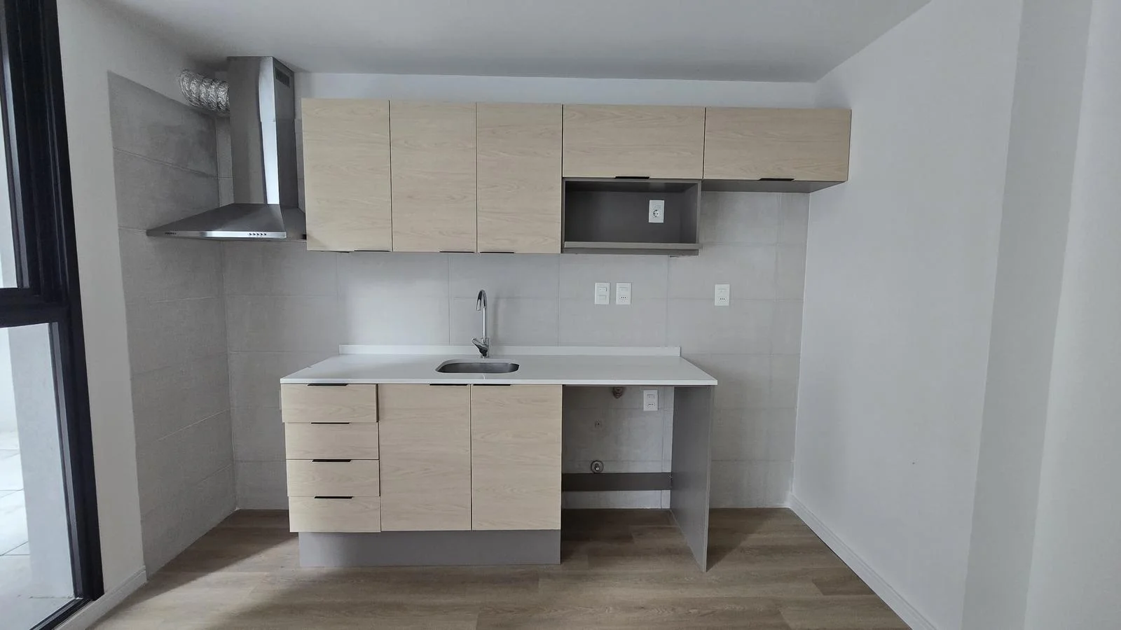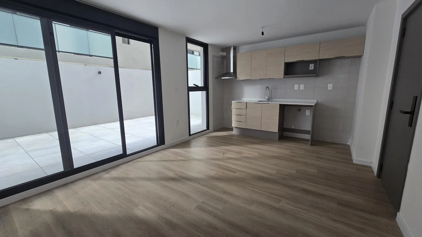 Cuenta con living comedor con cocina integrada con muebles aéreos y bajo mesada. 1 dormitorio con placar. Terraza a lo ancho del apartamento de más de 28m².