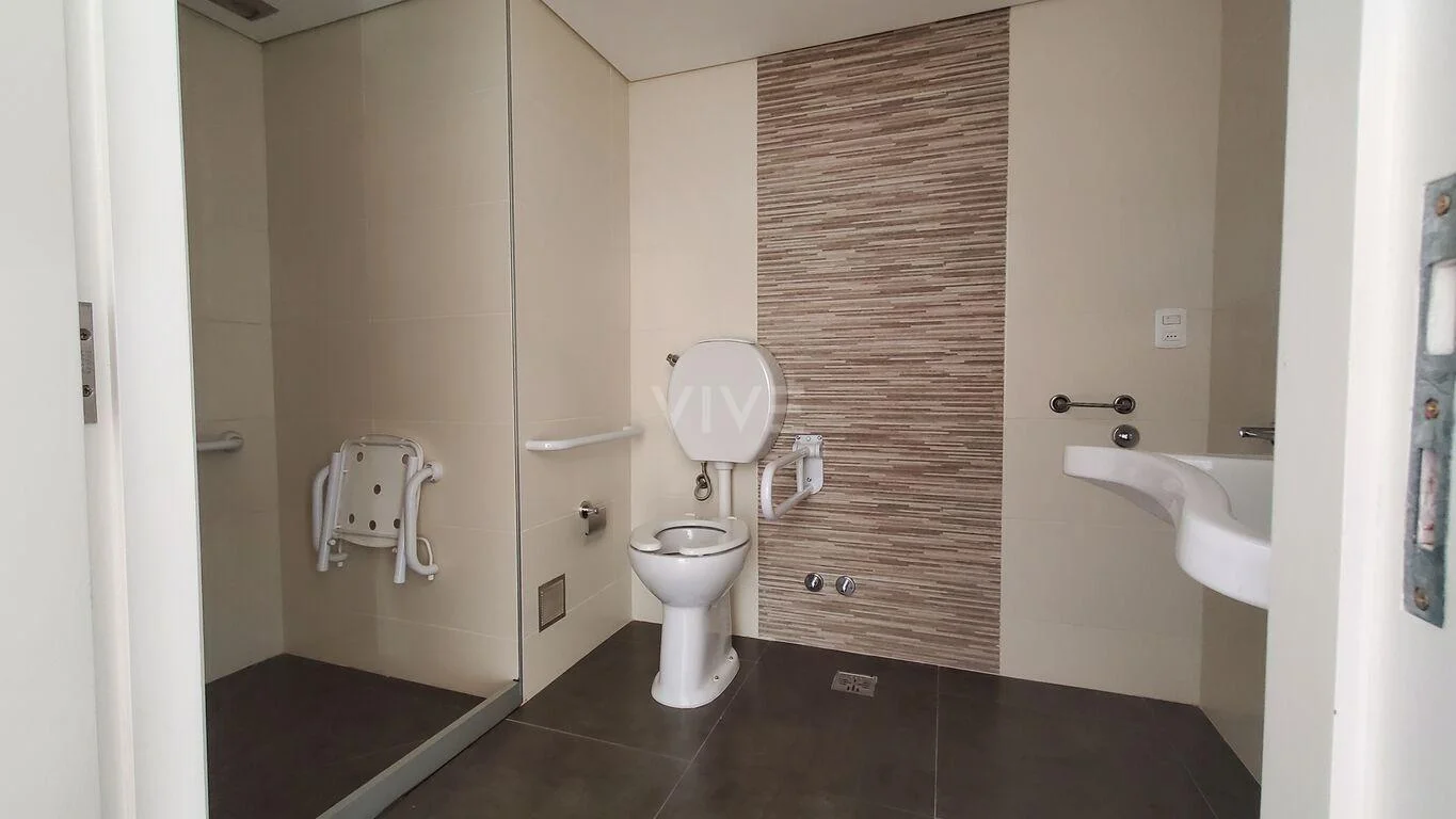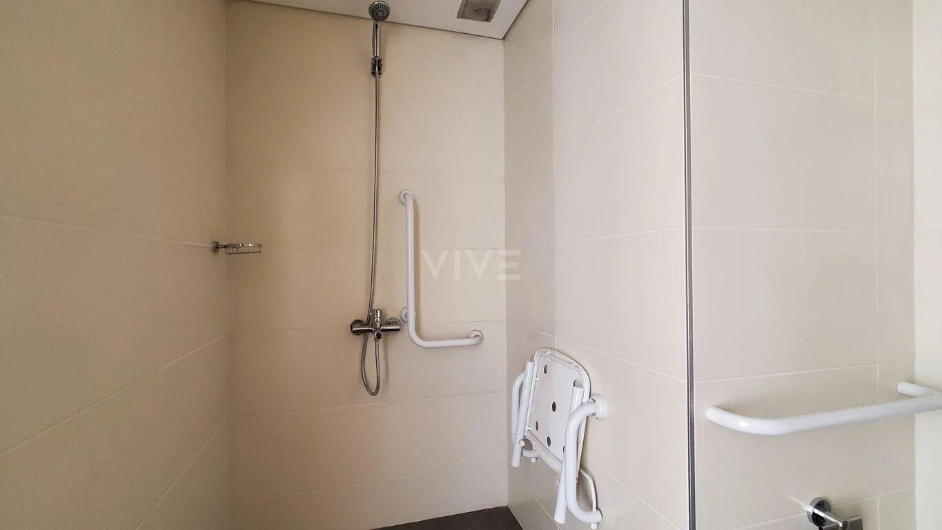 Baño accesible, apto para personas mayores por su silla ubicada adentro de la ducha y barandas laterales en inodoro y ducha.