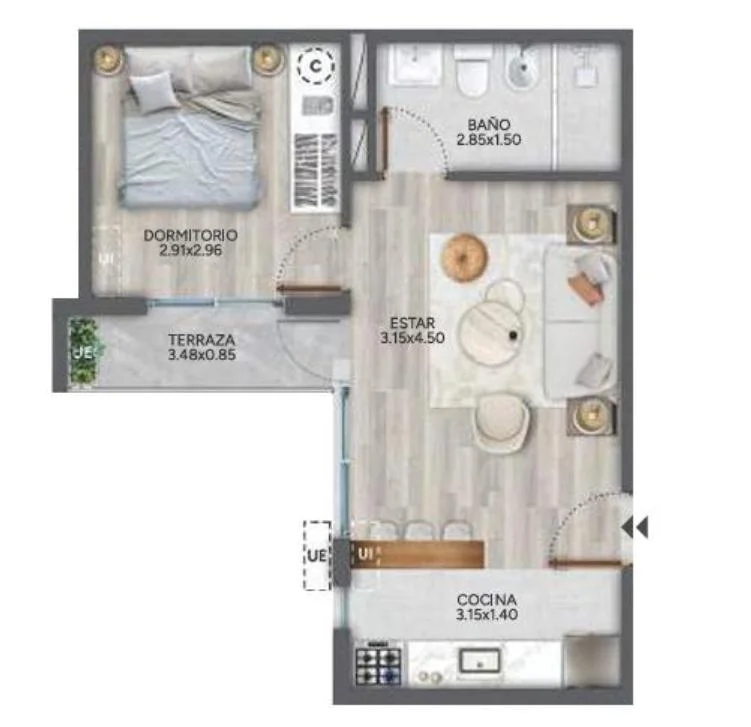 Este apartamento ofrece un diseño moderno y funcional, ideal para quienes buscan comodidad y buena iluminación. Cuenta con un amplio ventanal con salida a una terraza que aporta luz natural durante todo el día, creando un ambiente cálido y agradable.
