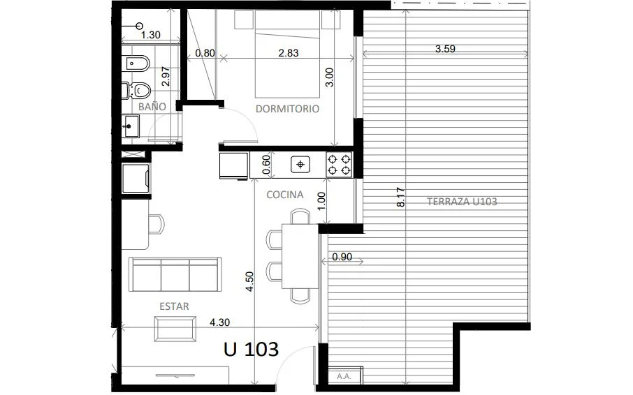 La unidad cuenta con cocina integrada, equipada con horno, anafe y campana, y se complementa con terminaciones de calidad como mesadas de cuarzo y revestimientos en porcelanato. El dormitorio dispone de placares empotrados, mientras que el sistema de automatización de persianas aporta practicidad y modernidad.