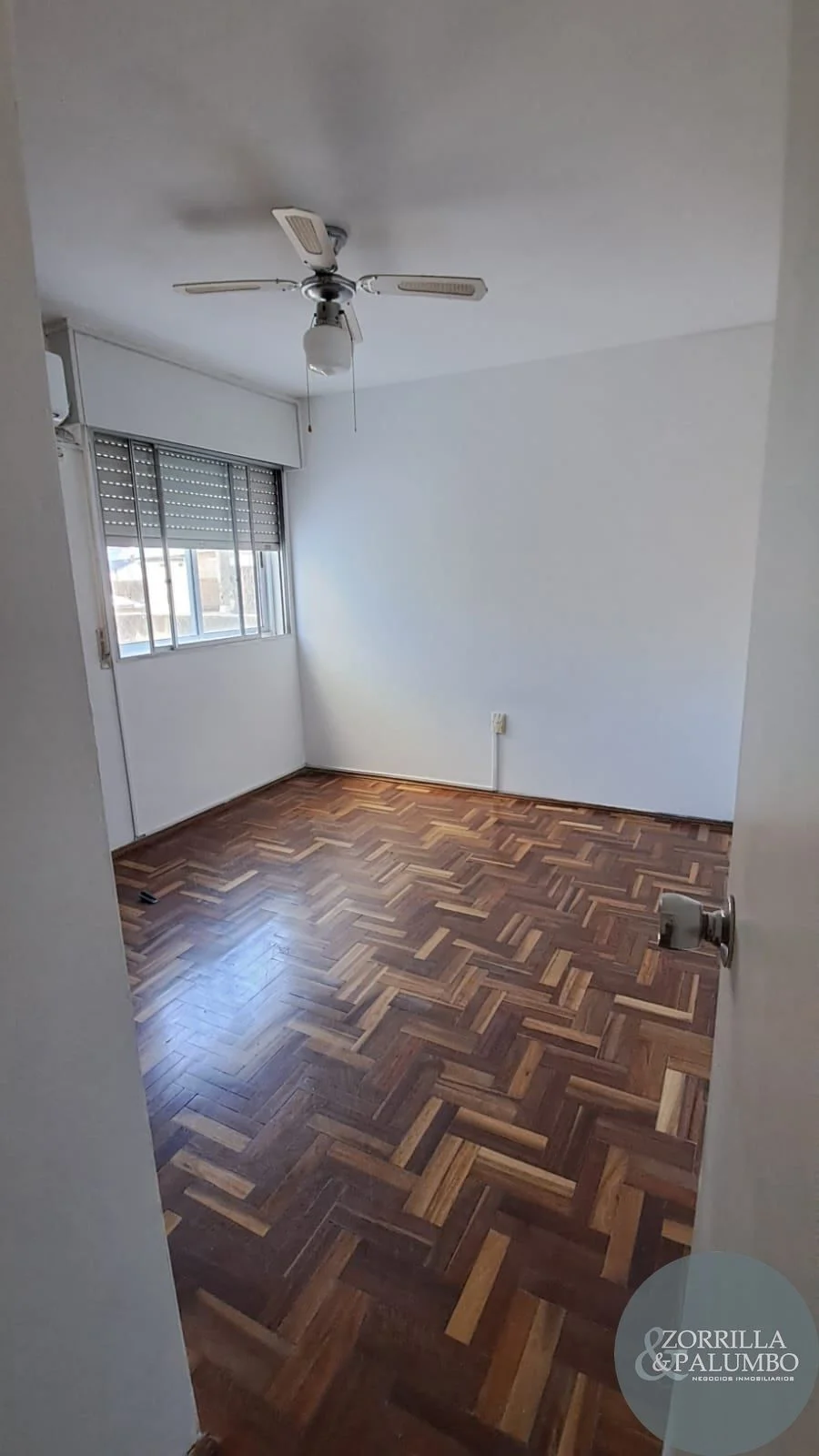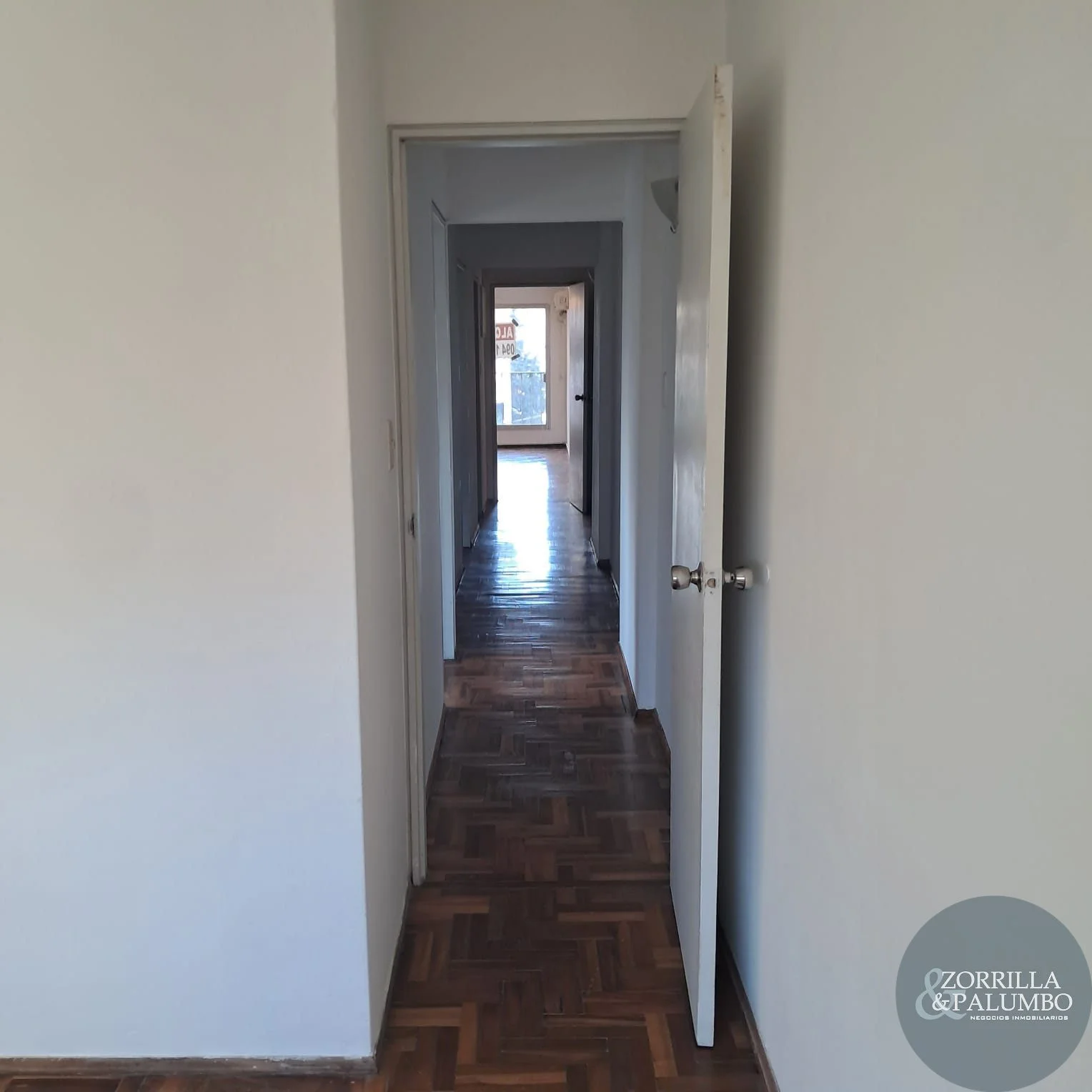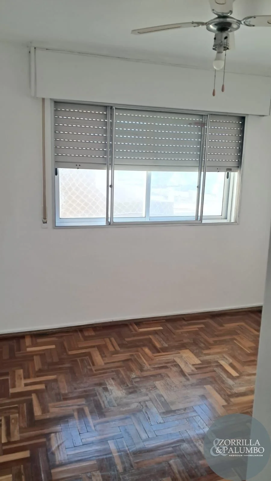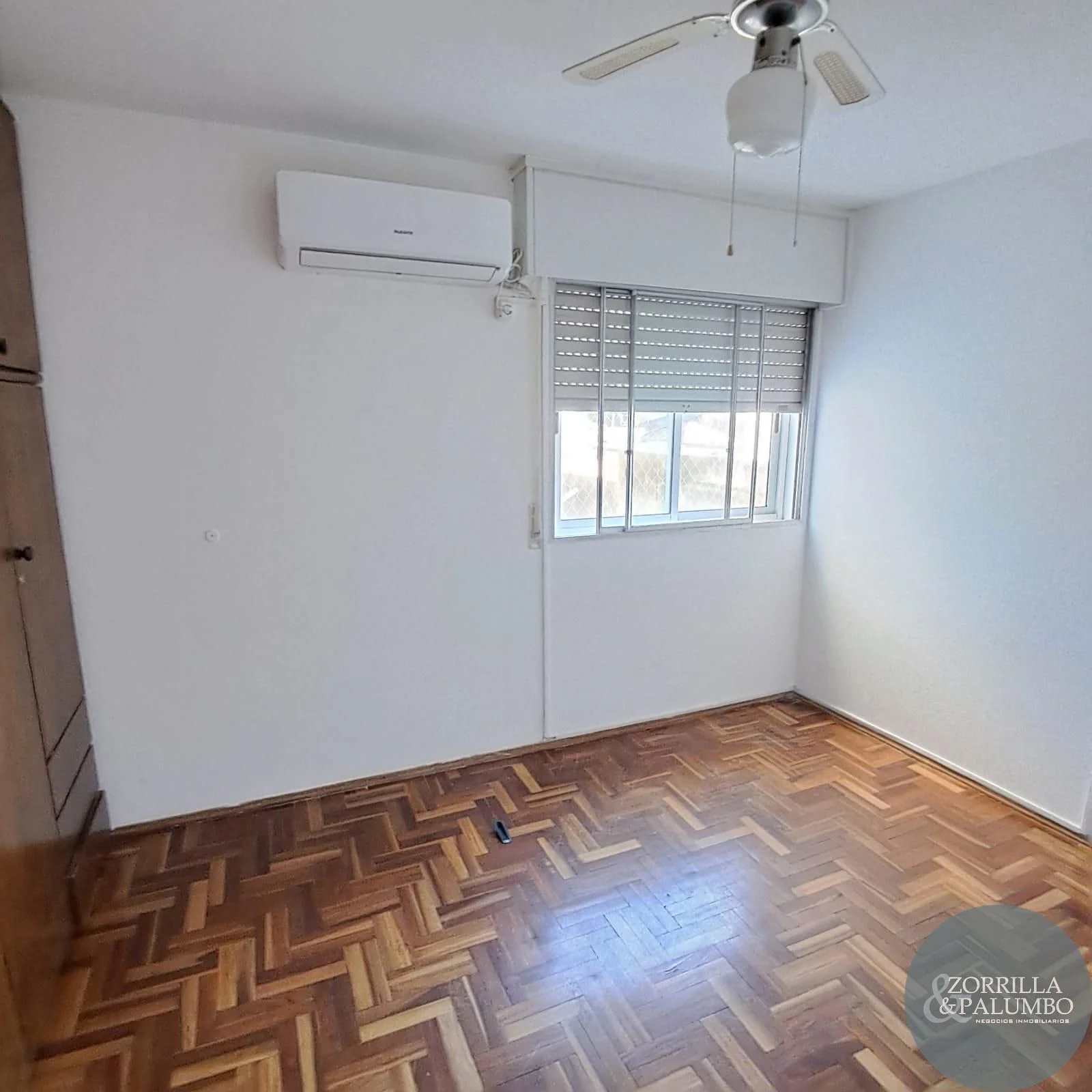 El apartamento se compone de tres dormitorios que dan hacia el contrafrente del edificio, cada uno equipado con doble ventana, persiana y tendedero. El dormitorio matrimonial es de buenas dimensiones y cuenta con placar y aire acondicionado. El primer dormitorio secundario, el más pequeño, es ideal para colocar una cama con mesa de luz y ropero, y también puede ser utilizado como oficina. Al fondo, se encuentra el segundo dormitorio secundario, más espacioso, que permite acomodar perfectamente dos camas individuales o una matrimonial, junto con un ropero. El edificio ofrece la comodidad de dos ascensores y aunque la unidad no cuenta con garaje, se pueden alquilar espacios en dos parkings cercanos a la propiedad.