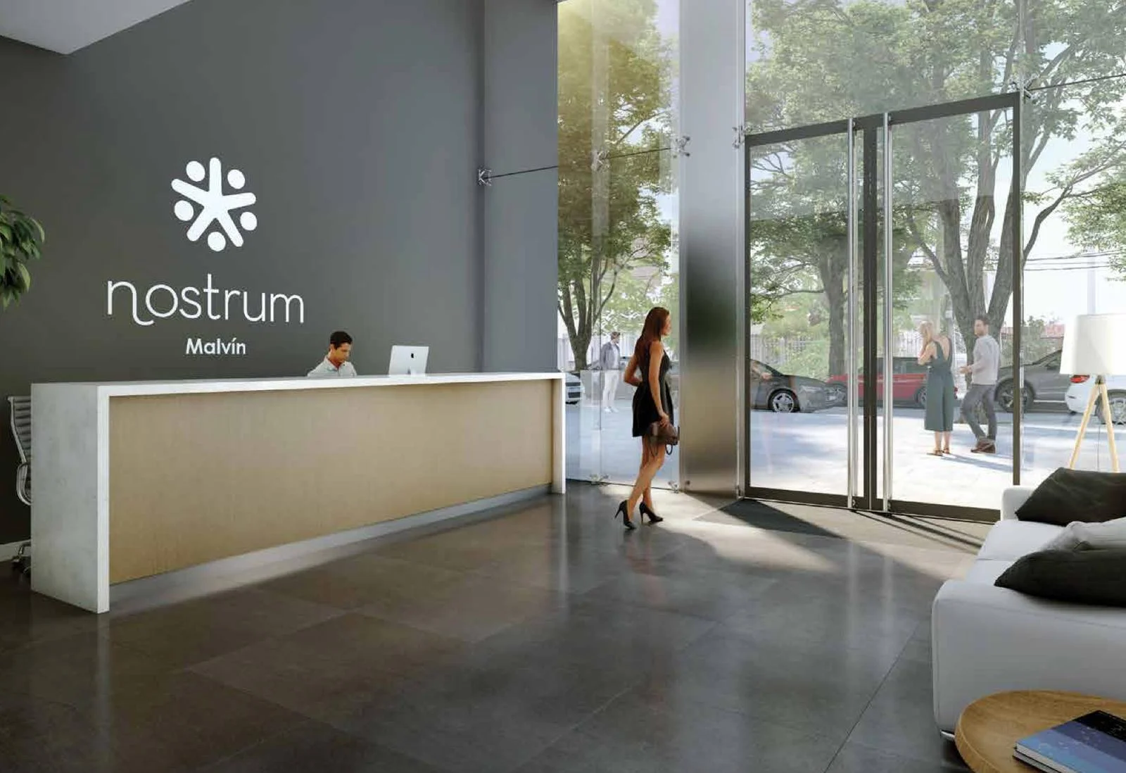 -Hall de doble altura con mobiliario contemporáneo
