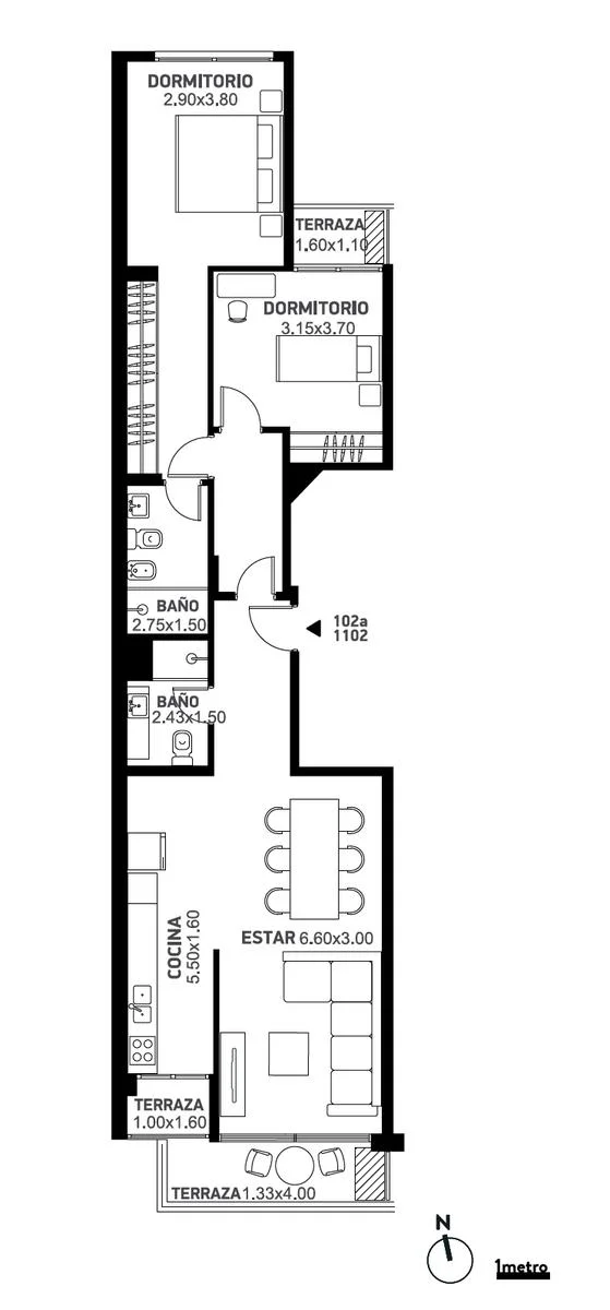 Piso 11 al frente, con vista al mar, doble orientación, living al sur y dormitorios al norte.,