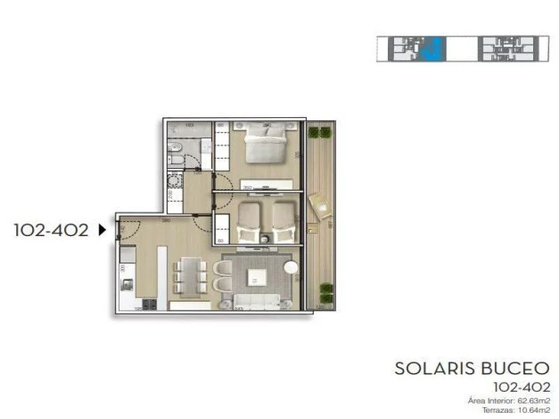 ¡TreeHouse Bines Raíces Vende! Apartamento de 2 Dormitorios en Buceo. Proyecto en construcción, fecha de entrega estimada Agosto 2026. Ubicado sobre la calle Donizetti a metros de la Rambla de Buceo, con excelente conectividad y en cercanía a servicios, colegios y liceos. Solaris Buceo se desarrolla en 2 boques con 4 niveles de apartamentos, en el 5 de la primera torre se encuentran los amenities. Compuestos por 20 unidades totales de las cuales 8 son 2 dormitorios y 12 de 1 dormitorio. Unidad 302: se trata de una planta de 73.2 m2 totales, 62.6 m2 internos y 10.6 m2 de terraza. Compuesto por cocina integrada al living comedor con salida a la terraza, 2 dormitorios y 1 baño completo. Terminaciones y cualidades Living comedor y dormitorios. Pisos vinílicos de alta resistencia en cocinas, living, comedor y dormitorios. Aberturas doble vidrio hermético y previsión para motor de persiana eléctrica. Placares de acuerdo al diseño de la tipologia. Instalación de Aire Acondicionado en living y dormitorios. Baños Pisos de y paredes con revestimiento cerámico o porcelanato de alta calidad. Lavatorio con mueble integrado. Cocina Anafe y campana. Mesada de cuarzo o simil. Pileta simple de acero inoxidable. Placares sobre y bajo mesada. Terraza Deck de madera. Baranda de aluminio con vidrio. Consulte por tipologías de 1 dormitorio. Garages disponibles desde USD 26.000 . Caracteristicas: DORMITORIO EN SUITE, LAUNDRY, PLACARD EN COCINA, PLACARD EN DORMITORIO, CONEXION PARA LAVARROPAS XINTEL (TBR-TBR-5333)