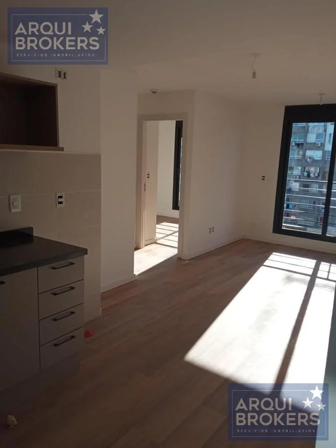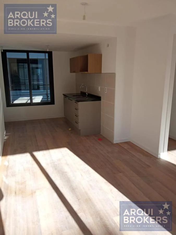 Living comedor con terraza, cocina integrada, 2 dormitorios y 1 baño.