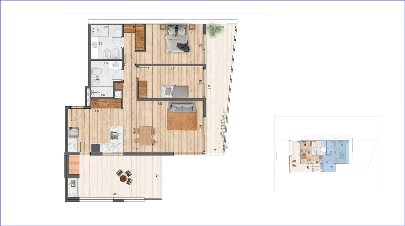 Living comedor con terraza con parrillero, cocina integrada con placares, anafe eléctrico, extractor con campana y termotanque. 2 dormitorios con placares y salida a otra terraza, 1 en suite con vestidor, 2 baños completos con extractor.