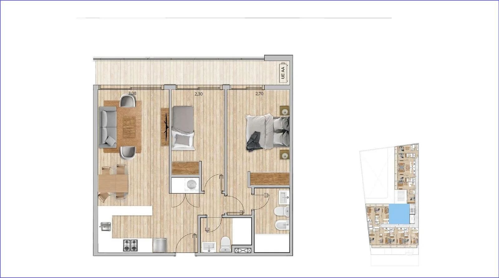 Living comedor con terraza, cocina integrada con placares, campana, anafe y termotanque, 2 dormitorios con placard y cortina de enrollar, 1 en suite, 2 baños completos con placard.