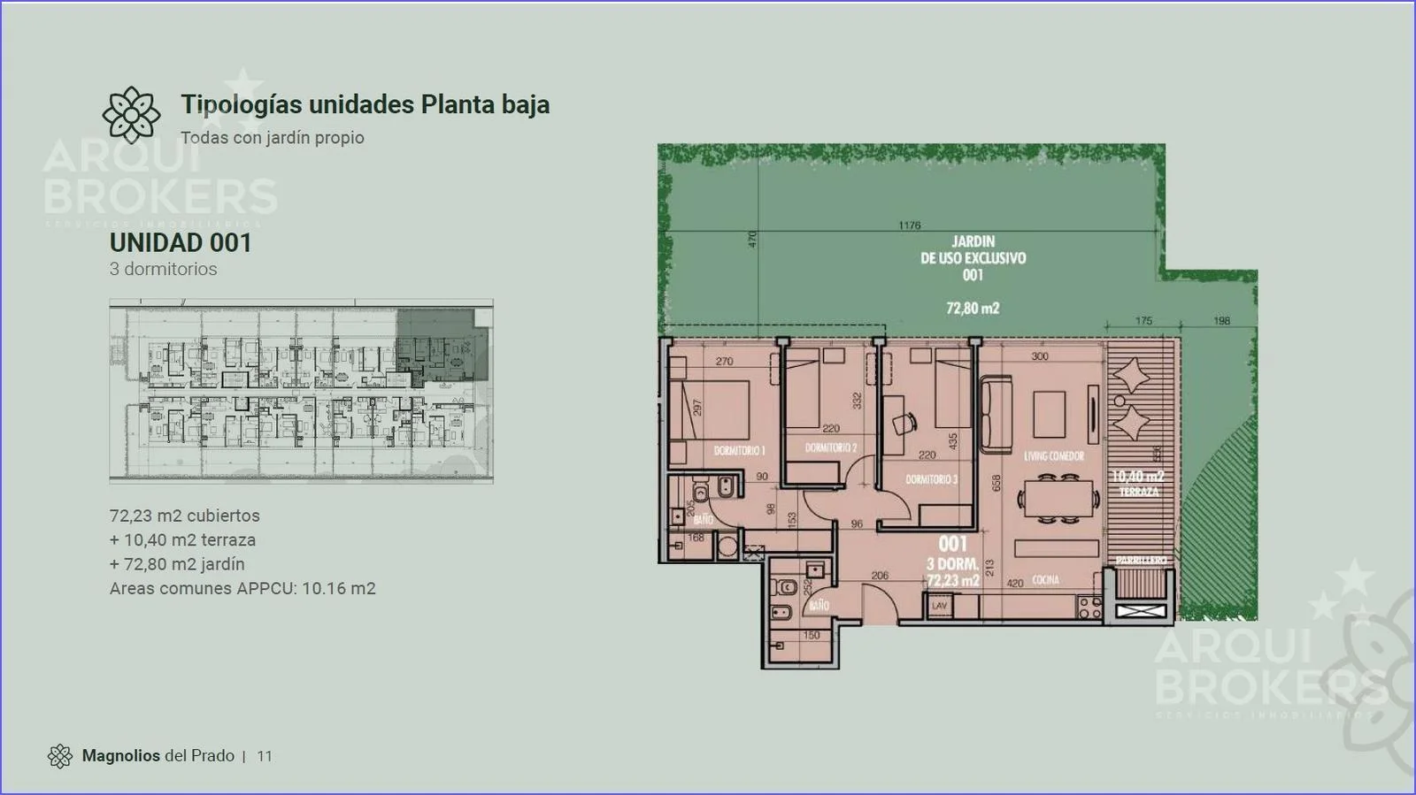 Jardín de 73m2. Living comedor con terraza con parrillero, cocina integrada con placares y terraza lavadero, 3 dormitorios, 1 en suite, 2
