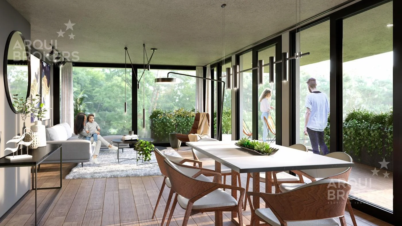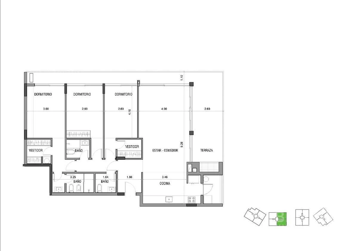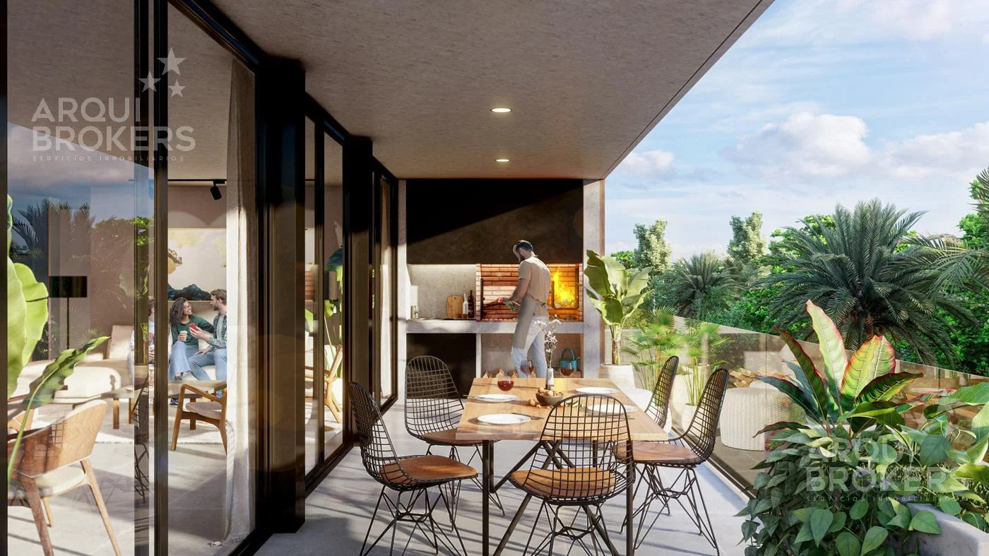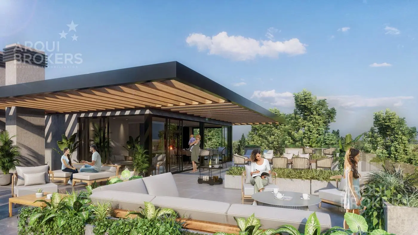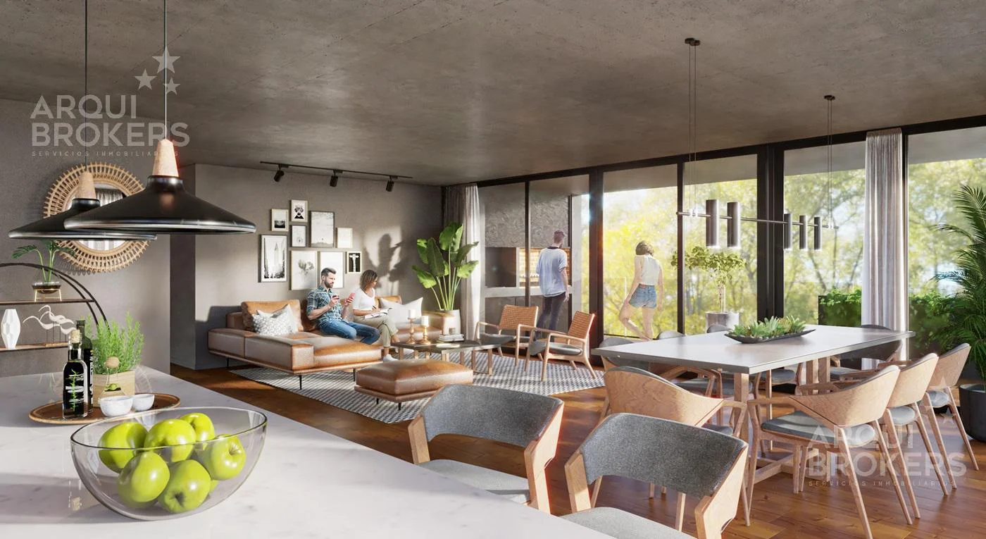 Living comedor con salida a terraza con parrillero, cocina integrada con placares, terraza lavadero, 3 dormitorios, el principal en suite con vestidor, todos con salida a terraza, 2 baños completo y 1 baño social.