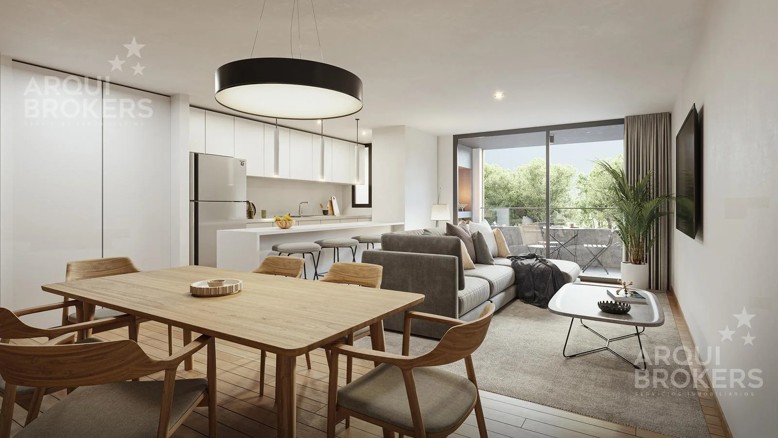 Living comedor con terraza al frente con parrillero, cocina definida con placares y terraza lavadero, 1 dormitorio en suite con vestidor y salida