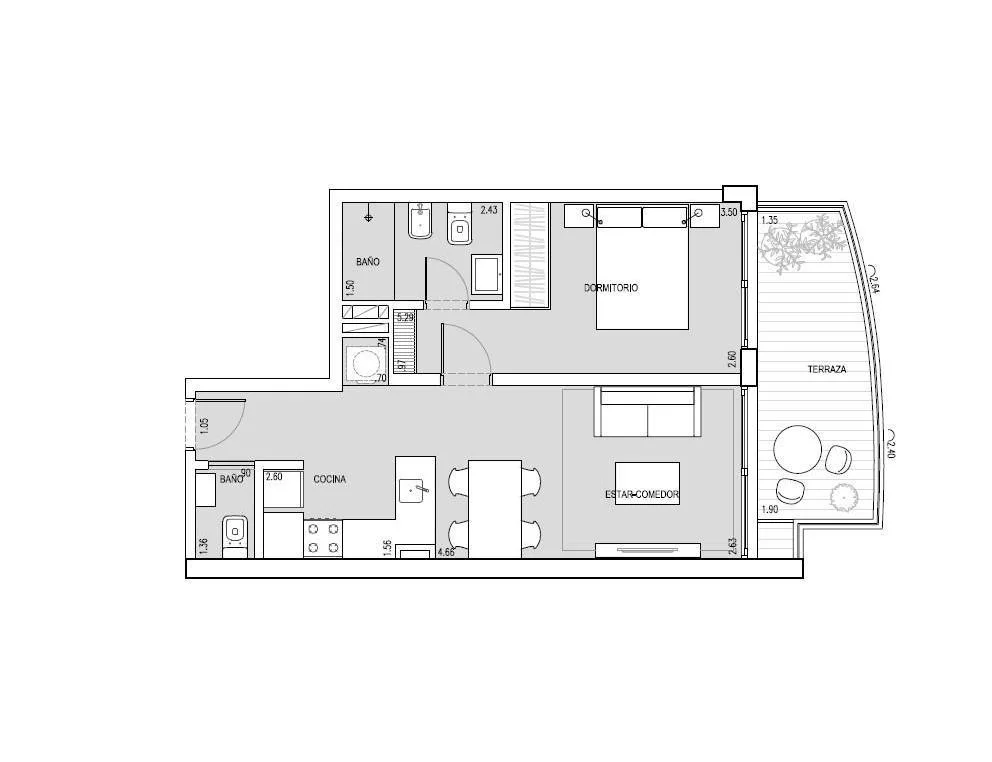 Living comedor con terraza al frente, cocina integrada con placares y conexión para lavarropas y campana. 1 dormitorio con terraza y placard,