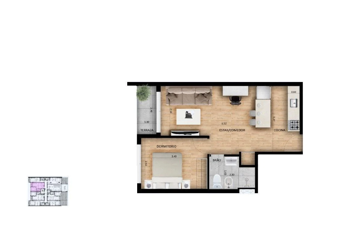 Living comedor con terraza, cocina integrada con placares bajo y sobre mesada, campana, horno y anafe, 1 dormitorio, 1 baño.