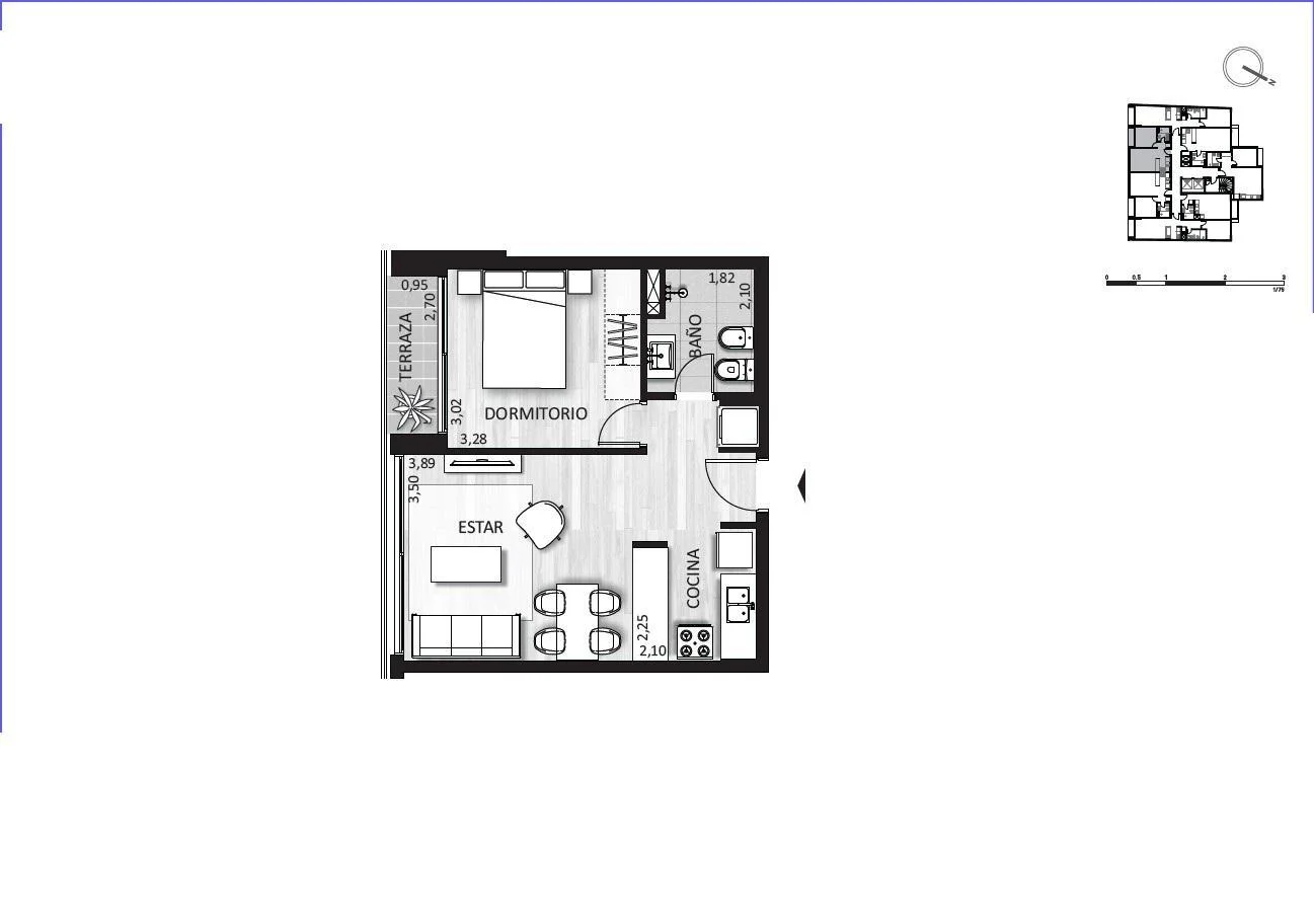 Living comedor con terraza al frente, cocina integrada con placard inferior, 1 dormitorio al frente con cortina de enrollar, 1 baño completo.