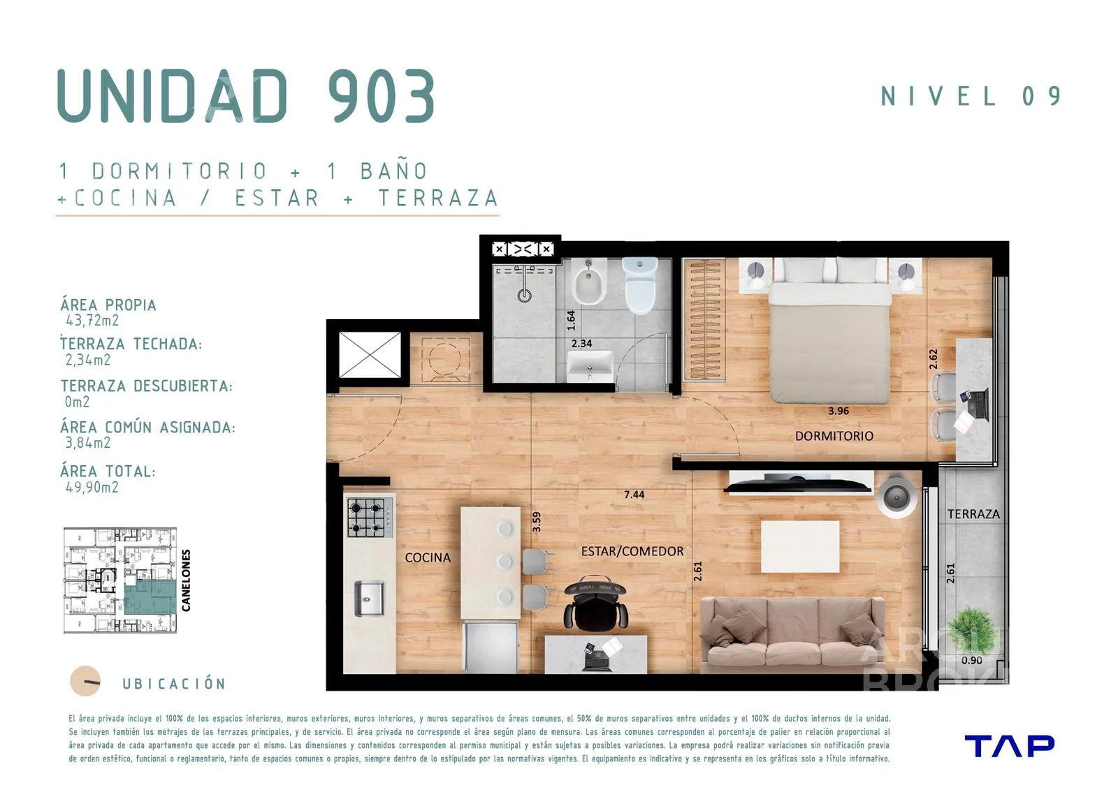 Living comedor con terraza al frente, cocina integrada con placares bajo y sobre mesada, campana, horno y anafe, 1 dormitorio con salida a terraza al frente, 1 baño.