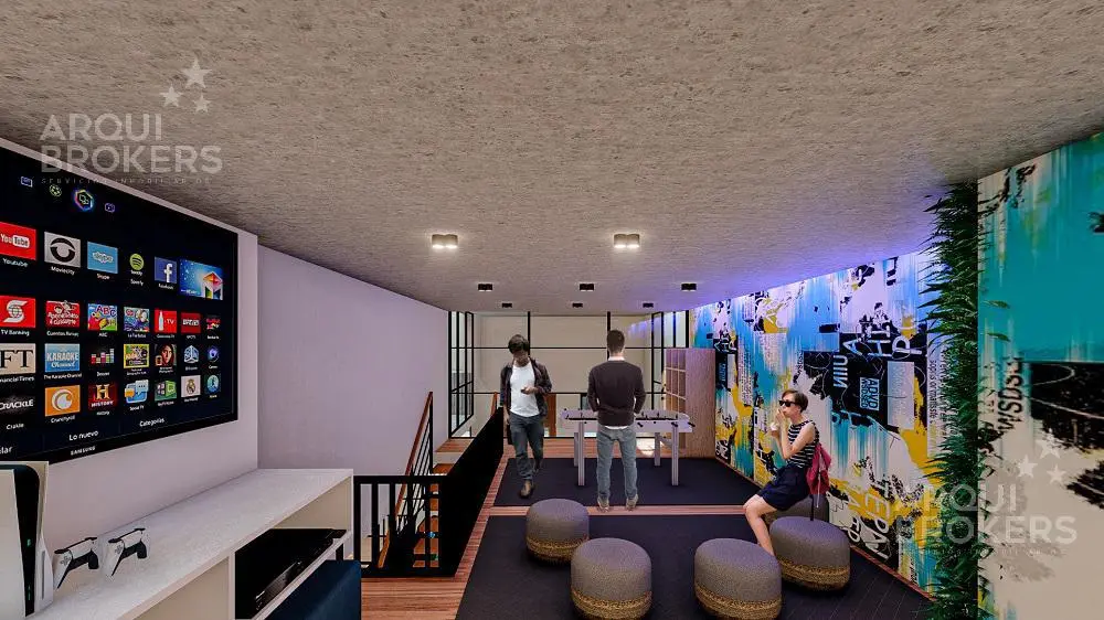 El edificio cuenta con barbacoa abierta y cerrada, gimnasio, solárium, cowork, sala de reuniones, coliving, laundry, playroom, CCTV y bicicletas.