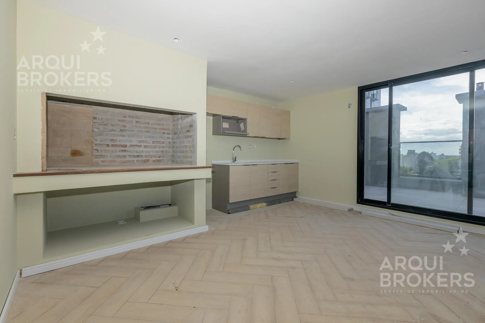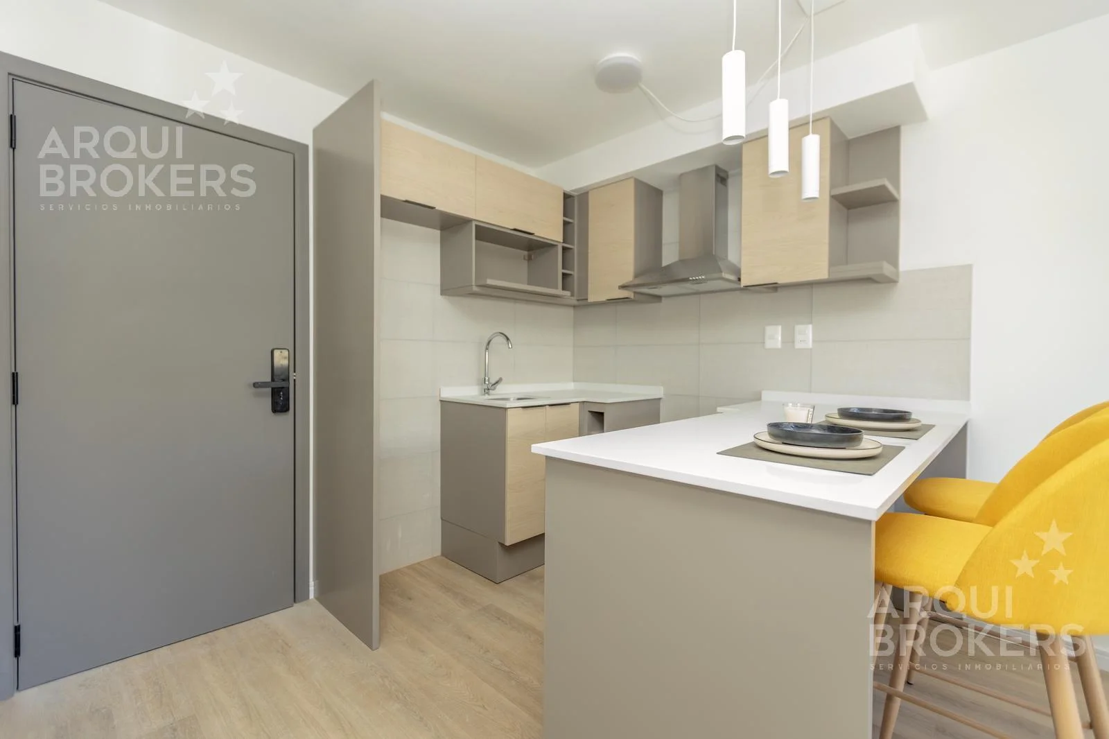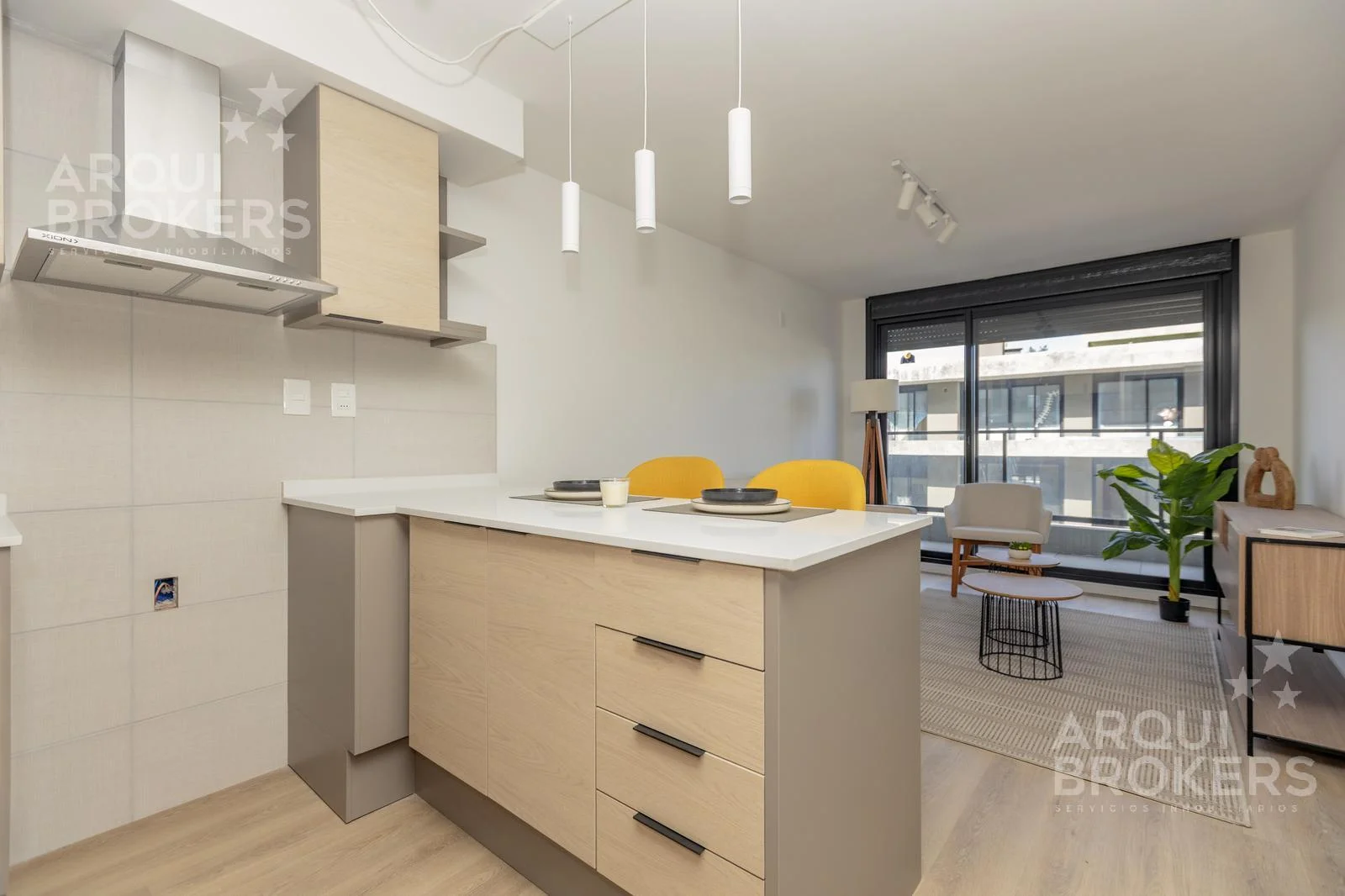 Living comedor con terraza, cocina integrada con placares, 1 dormitorio, 1 baño.