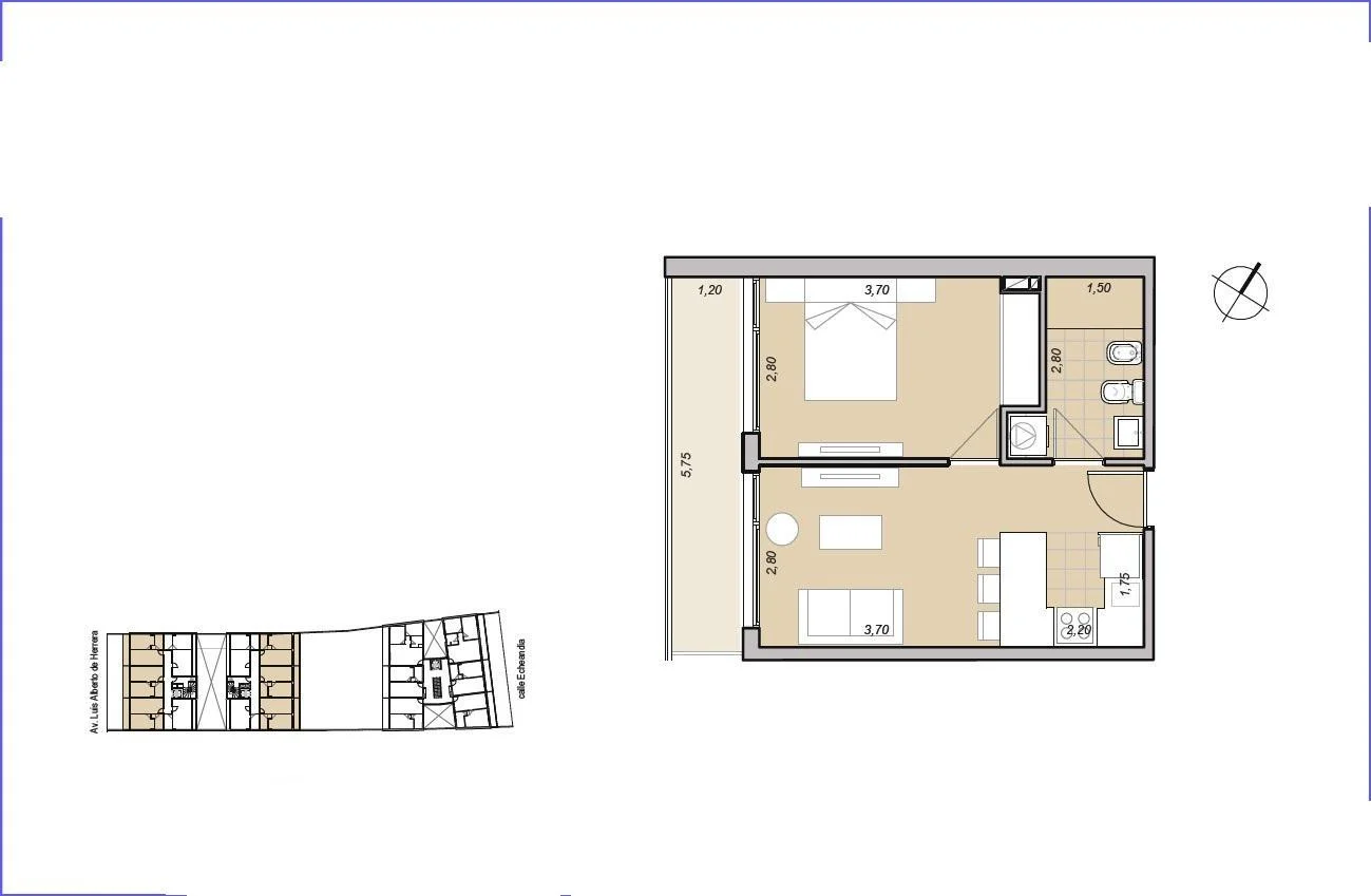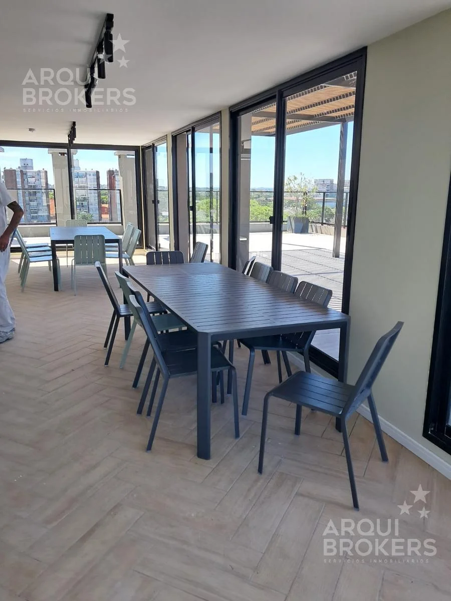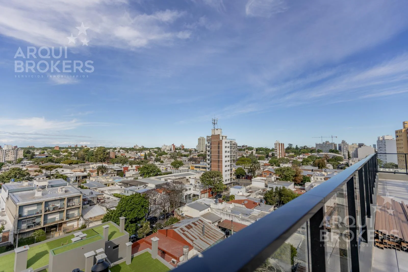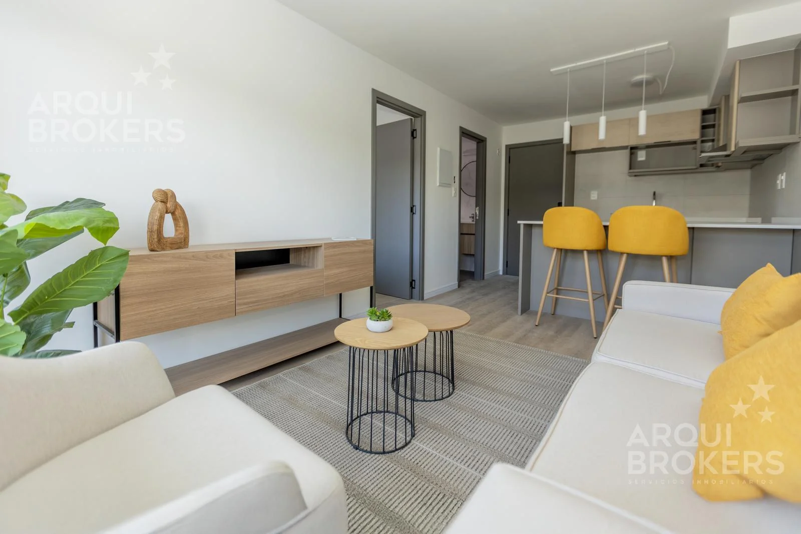 Living comedor con terraza, cocina integrada con placares, 1 dormitorio, 1 baño.