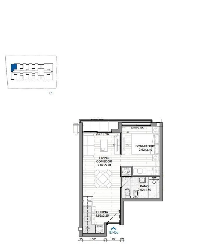 Living comedor con terraza, cocina integrada con placares, 1 dormitorio y 1 baño.
