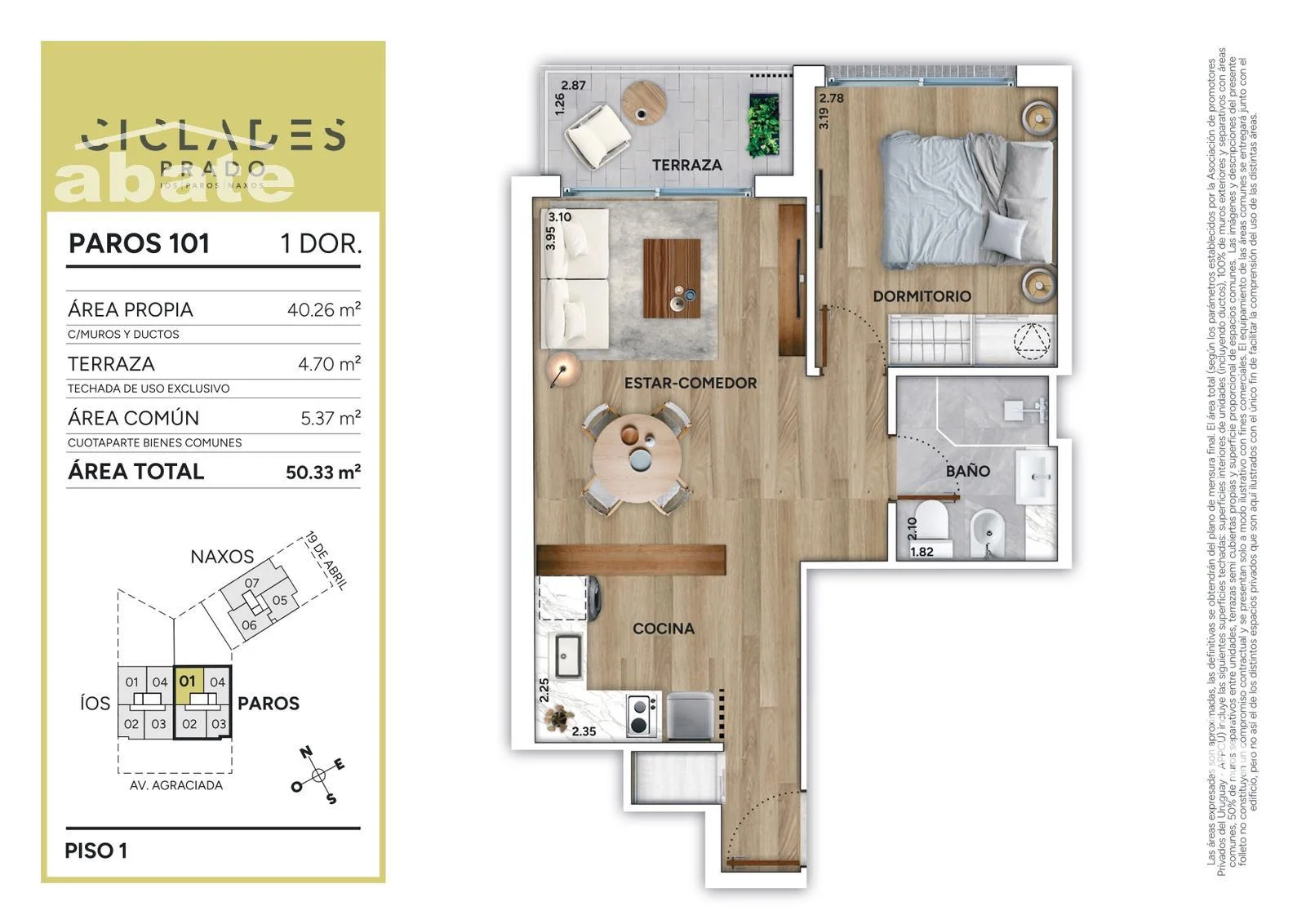 Cíclades Prado es un condominio de tres edificios de planta baja y tres pisos, (ÍOS, PAROS y NAXOS, implantado en un predio que atraviesa la manzana y le abre frente a dos avenidas icónicas del barrio: Av. Agraciada y Av. 19 de Abril.