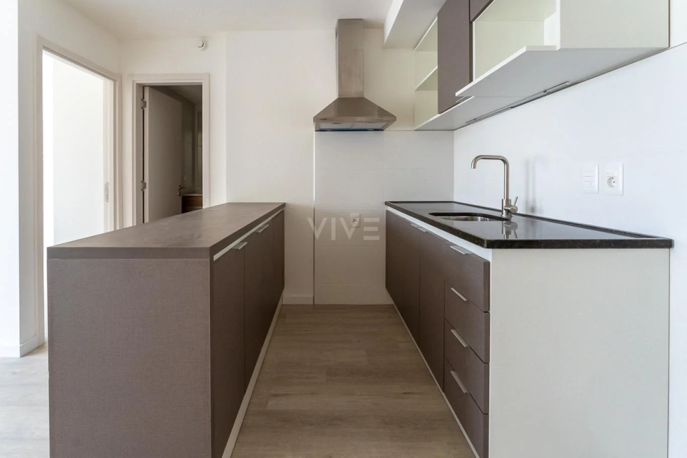 Cocina integrada con campana, barra desayunadora, aéreo y bajo mesada.