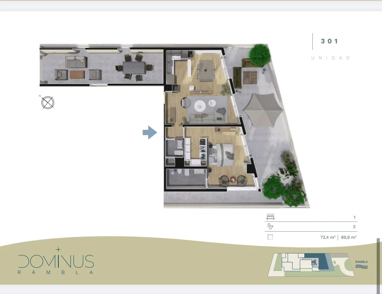 TreeHouse Bienes Raíces Alquila! Apartamento 1 Dormitorio con 2 Garajes en Carrasco, Montevideo. A estrenar! Ubicación: Frente a la Rambla de Carrasco, Dominus Rambla ofrece la calma de un entorno natural junto con amplias vistas al mar. A corta distancia, cuenta con una variada oferta gastronómica, áreas comerciales en Av. Bolivia y Arocena, y diversas alternativas de entretenimiento, logrando una combinación equilibrada entre tranquilidad, servicios y buena conectividad. Apartamento en tercer piso, al frente con orientación sur. Cuenta con recibidor, living comedor con salida a cómoda y amplia terraza, toilette, cocina integrada, un dormitorio con área de vestidor y baño completo. La unidad se destaca por su excelente distribución, con el área social integrada y salida a una gran terraza que rodea el apartamento, generando distintos espacios exteriores ideales para disfrutar. Los apartamentos cuentan con cocina equipada (anafe, horno y campana), aire acondicionado en los ambientes y placares en dormitorio. Metros internos: 73,40 m² + 89,90 m² de terraza. Amenities: Piscina y parrillero con vista a la Rambla. -- Imágenes corresponden a apartamento modelo. Consultá por condiciones de alquiler. Comercializa: Marina Porcile (+598 ***) Asociada a TreeHouse Bienes Raíces . Caracteristicas: DORMITORIO EN SUITE, LIVING COMEDOR, VESTIDOR XINTEL (TBR-TBR-5536)