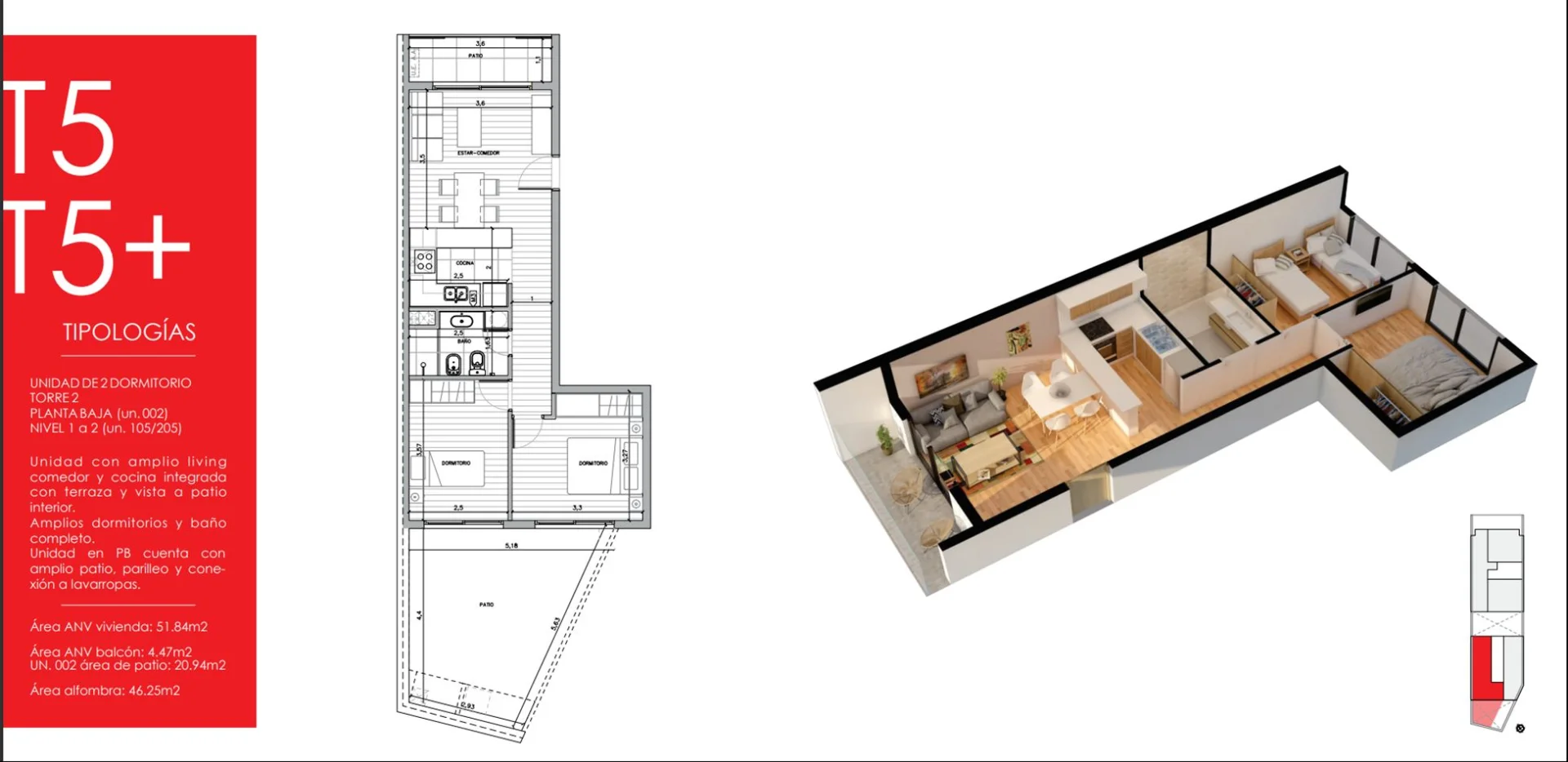 Edificio de 5 pisos. Apartamentos monoambientes, de 1 y de 2 dormitorios. Consta de 2 torres, ascensores desde los garajes hasta el 6to piso donde se encuentran los amenities.