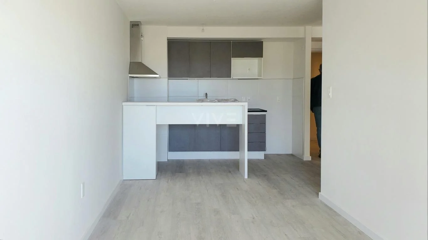 Cocina integrada con placares bajo mesada y aéreos, barra desayunadora y campana de extracción.