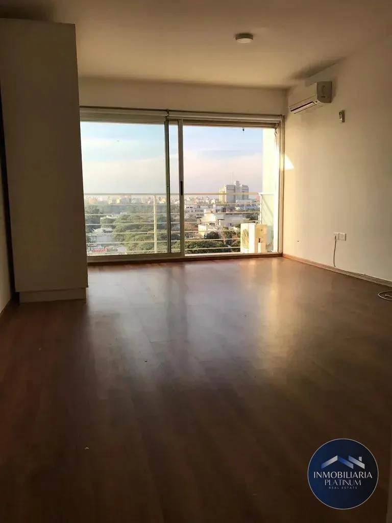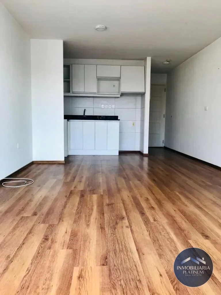 Este apartamento se destaca por su ambiente integrado, donde se encuentra una cocina equipada con muebles en tonos claros y un balcón privado que se conecta a través de ventanales corredizos. La distribución del inmueble incluye un baño y un área de almacenamiento, brindando funcionalidad y confort.