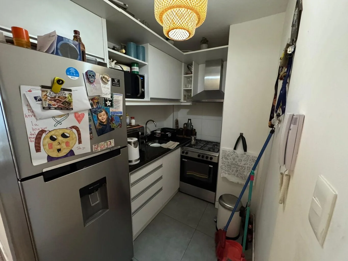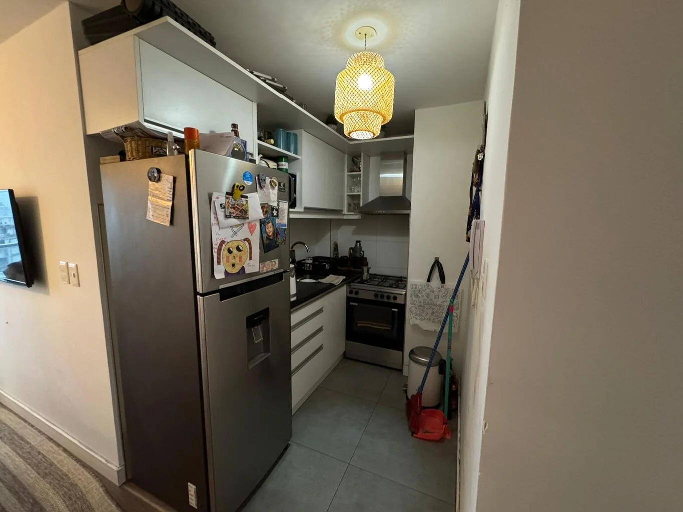 Al entrar nos encontramos con un pasillo de distribución y amplia cocina semi integrada, con muebles aéreos, bajo mesada, campana extractor.