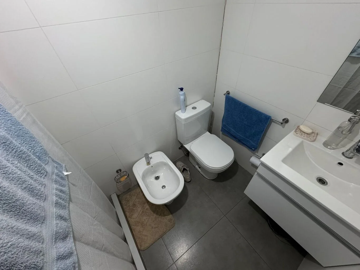 Baño completo, inodoro, bidet, ducha, espejo mueble con bacha.