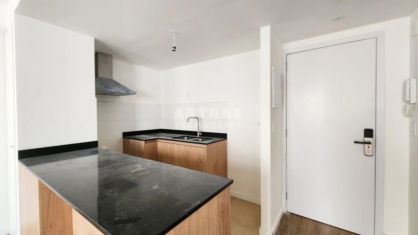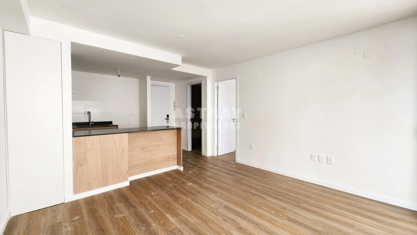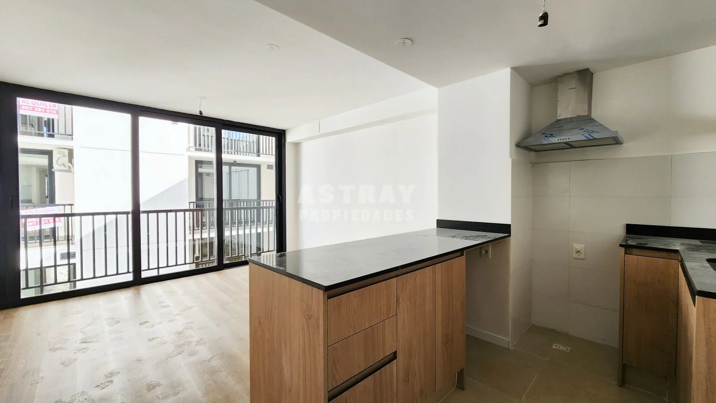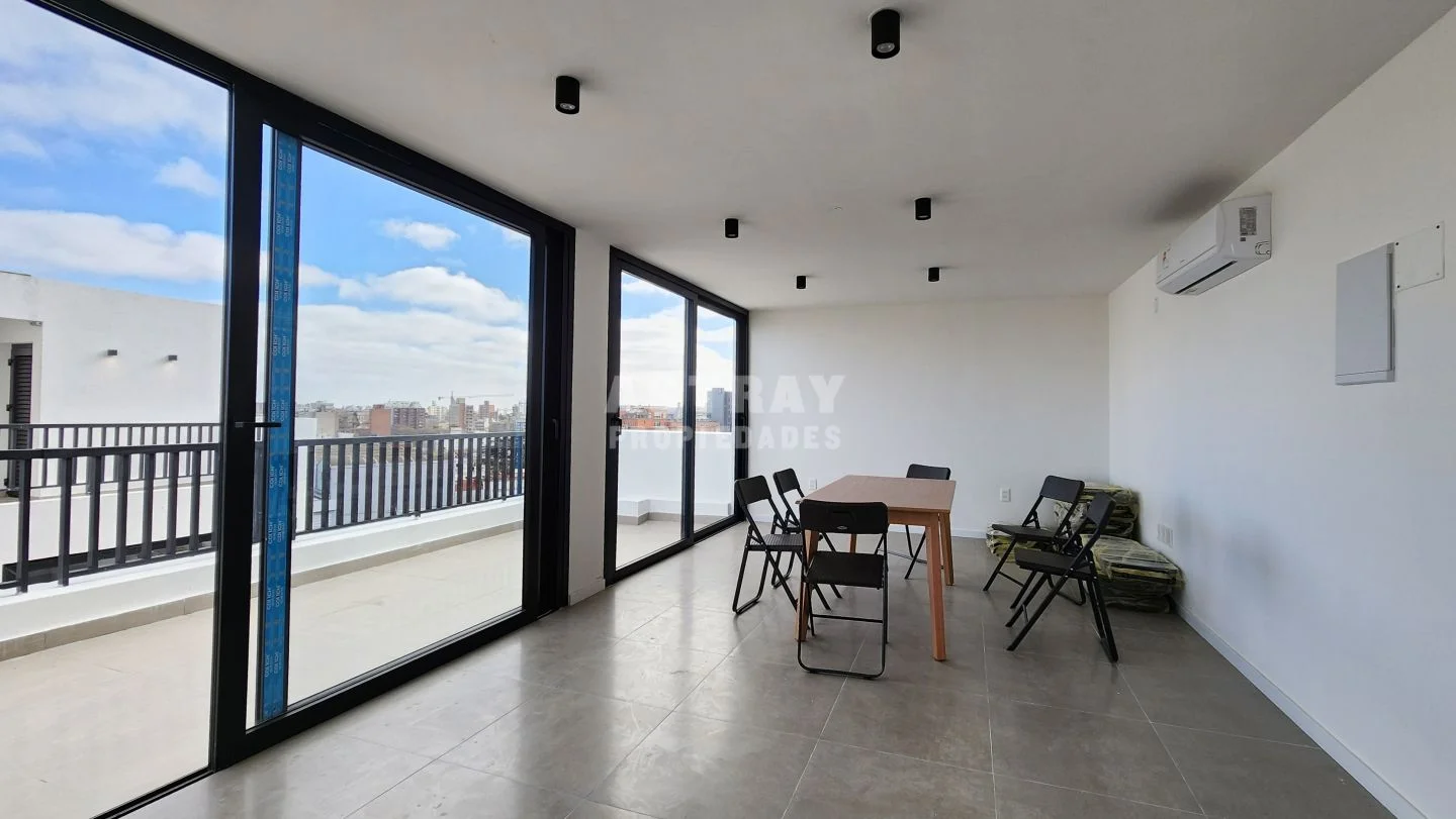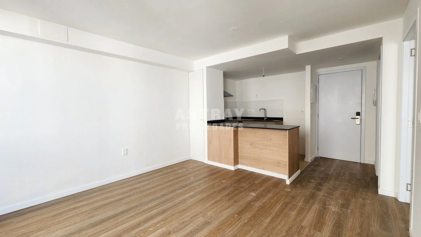 Living comedor amplio con cocina integrada, equipado con aire acondicionado y salida a cómodo balcón.