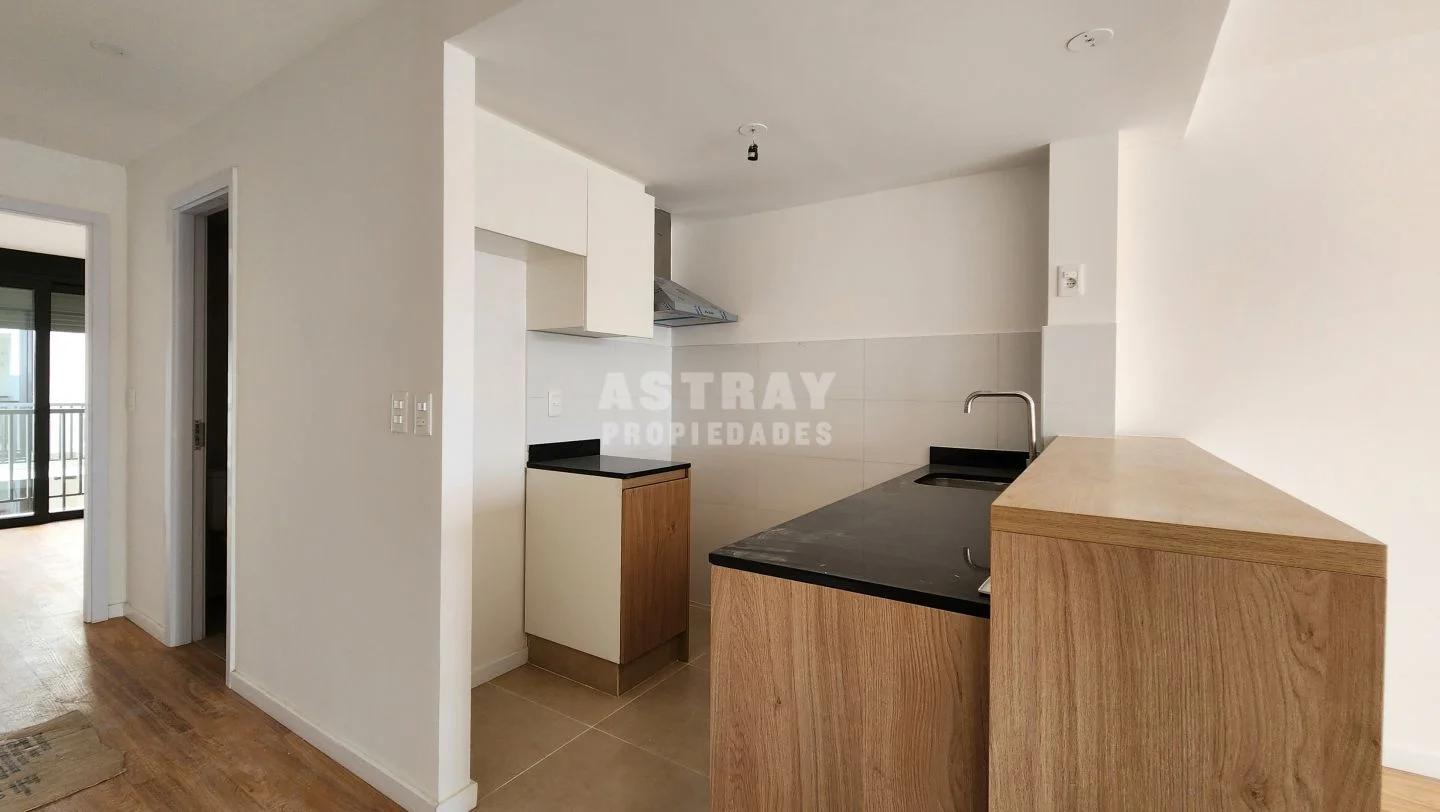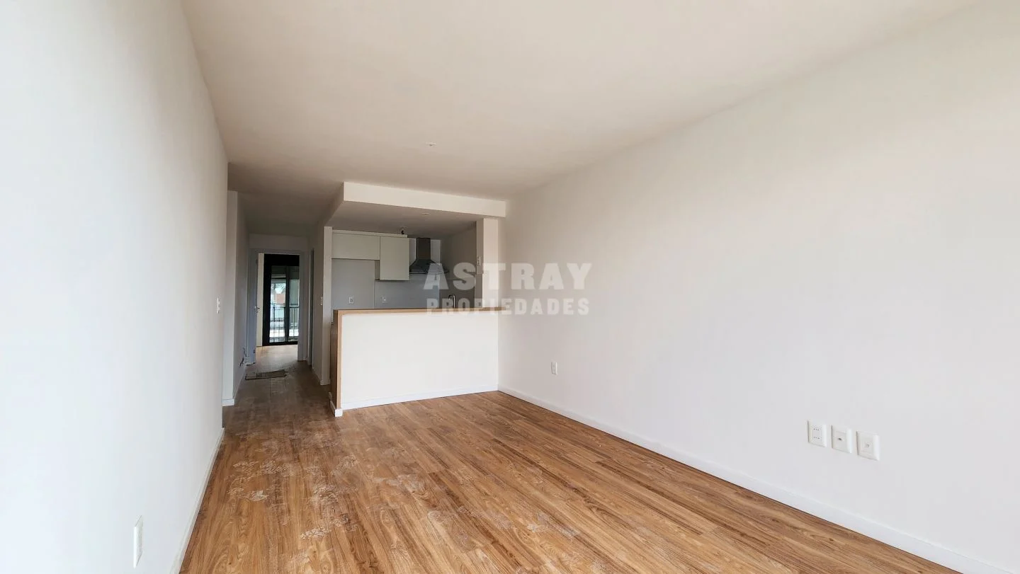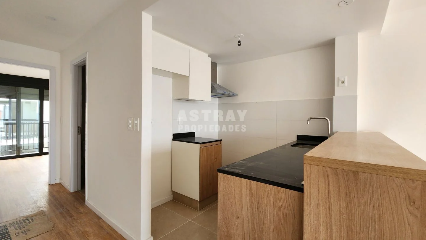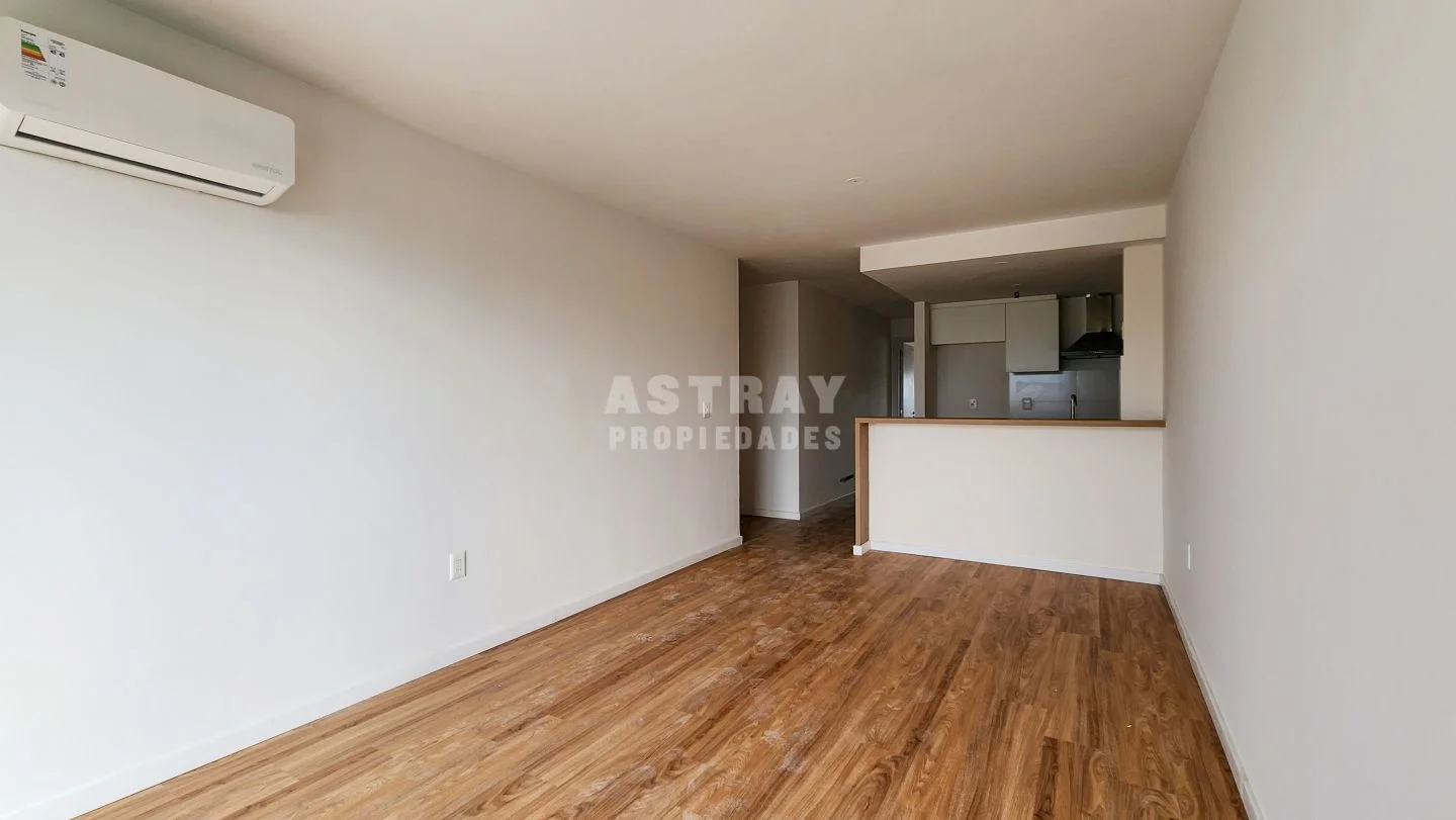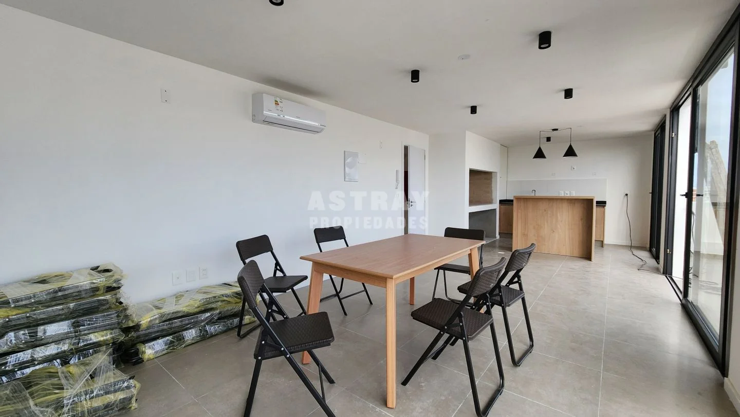 Living comedor amplio con cocina integrada, equipado con aire acondicionado y salida a cómodo balcón.