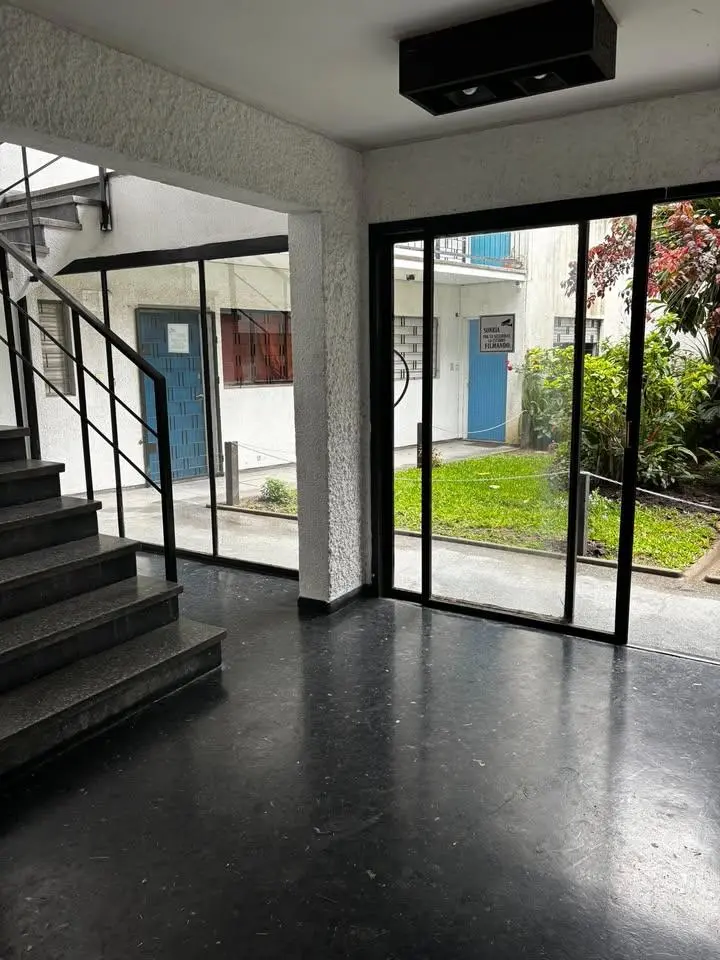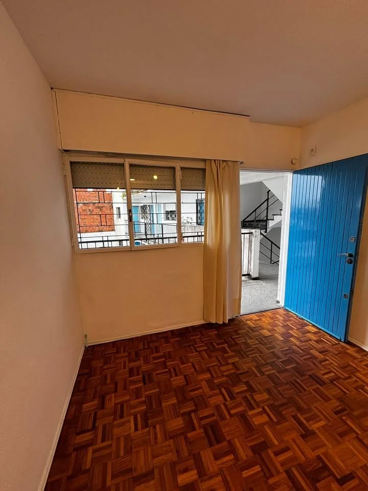 El apartamento se accede por una amplia y cómoda escalera y cuenta con ventanas con rejas y persianas de PVC en el living y el dormitorio, que dan hacia el jardín del edificio, asegurando tranquilidad y buena iluminación natural.