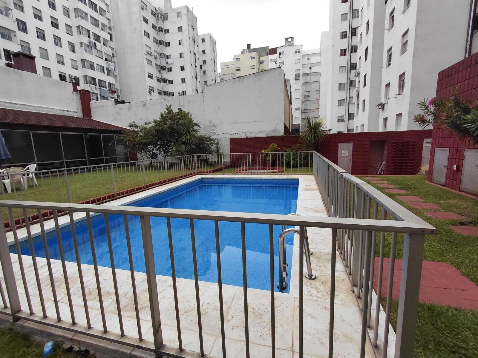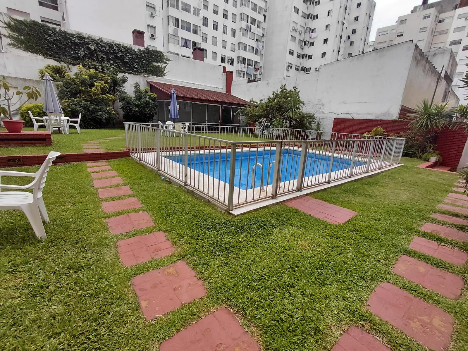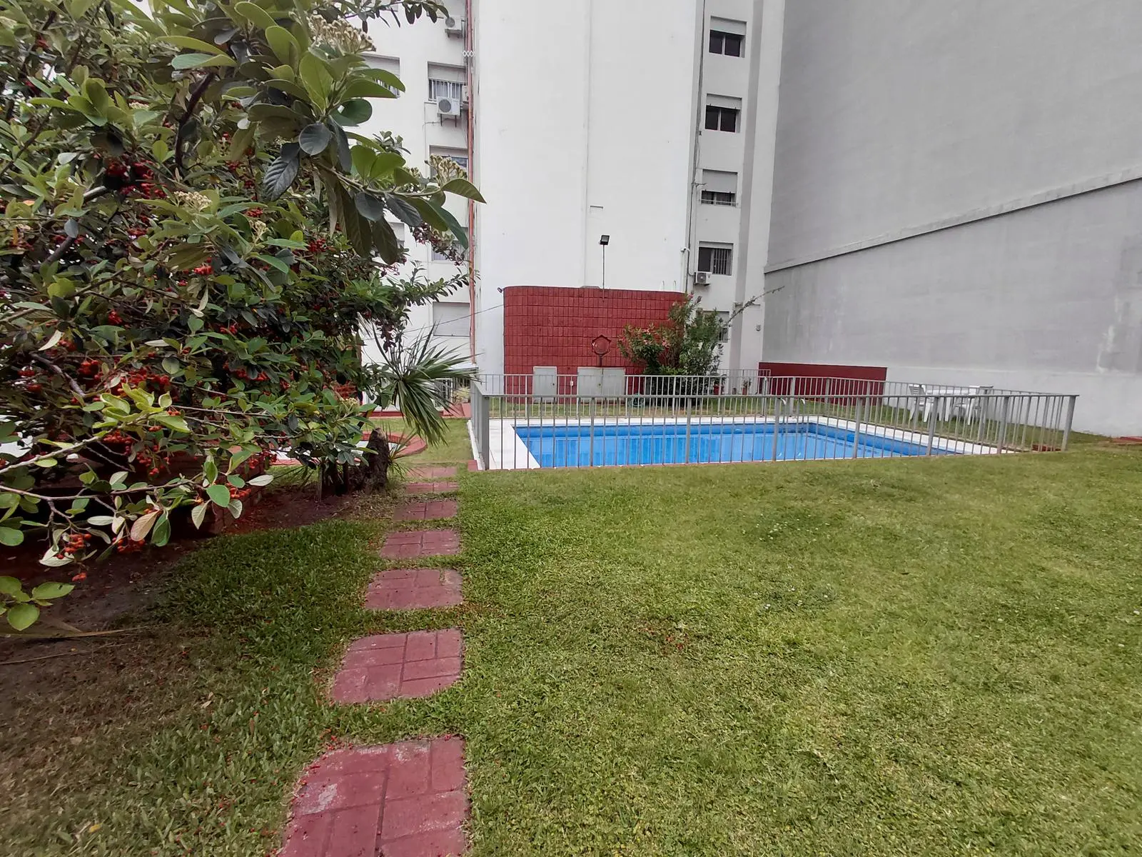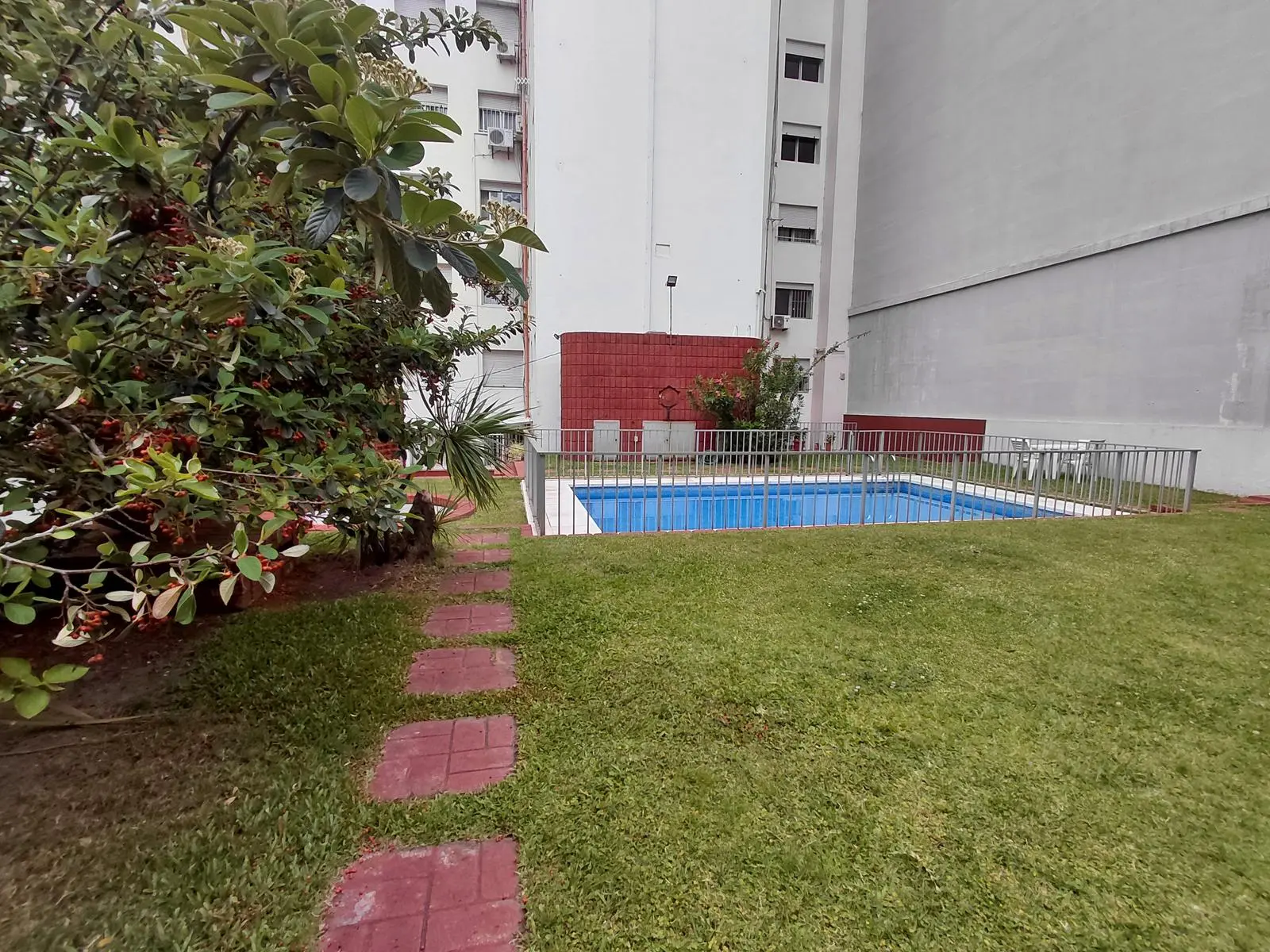Edificio con piscina, espacio verde y salón de usos múltiples y salón de fiestas.