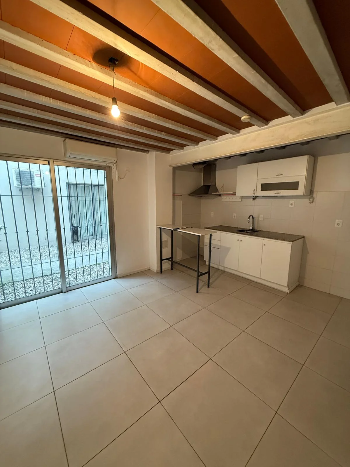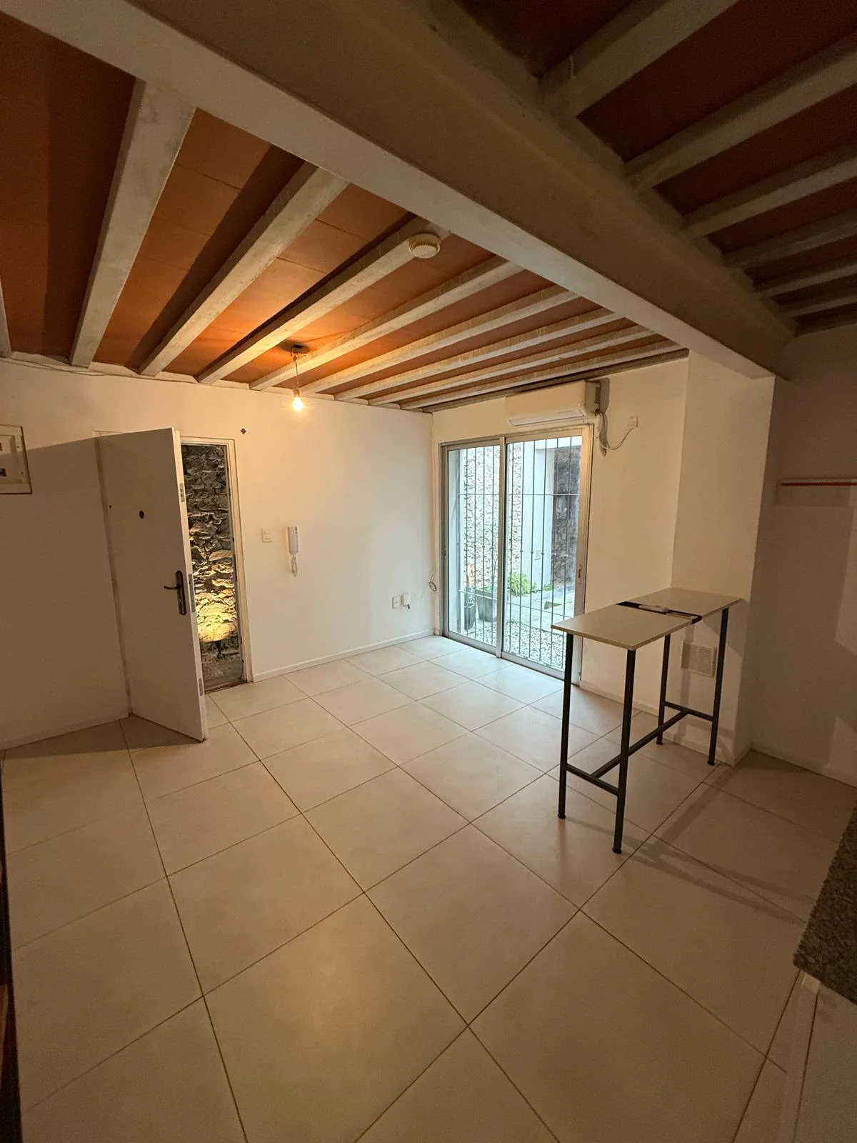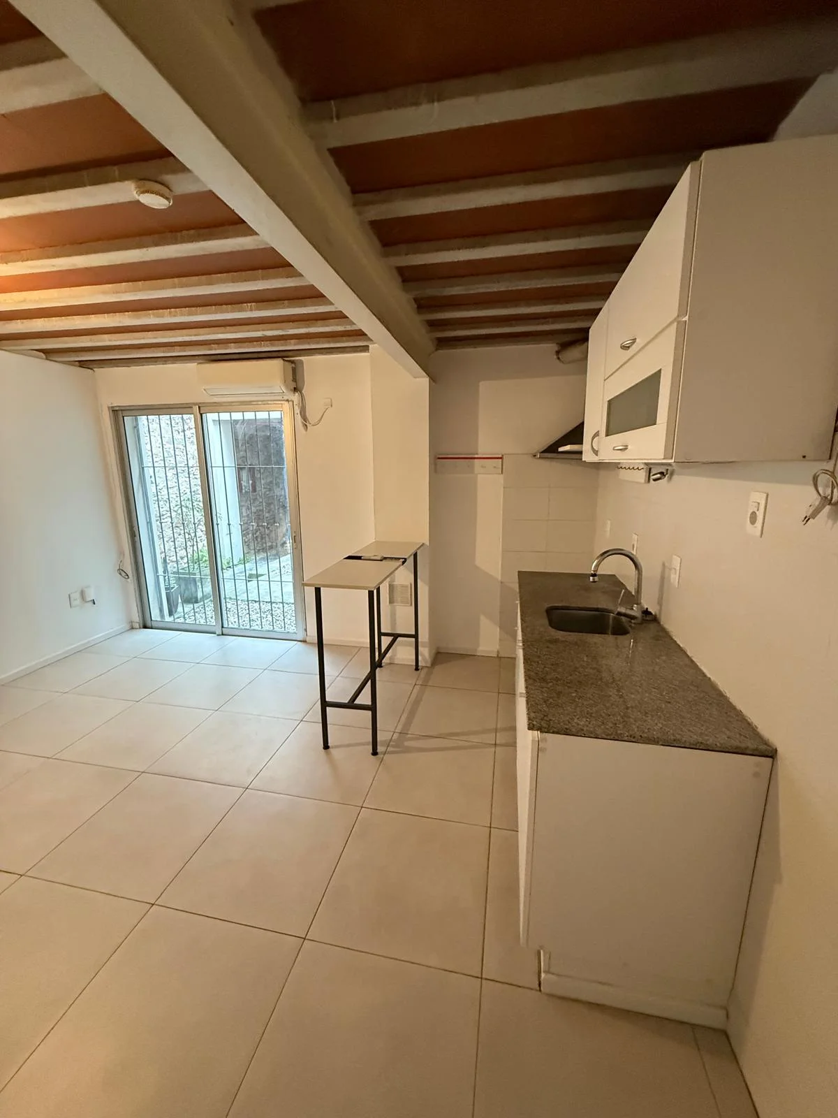 Cuenta con un dormitorio y un baño. La cocina está integrada al área principal, con muebles bajo mesada y alacena, y espacio para pequeño comedor. El ambiente principal tiene acceso mediante puerta ventana al exterior, con rejas de seguridad. El apartamento no dispone de ascensor ni cochera.