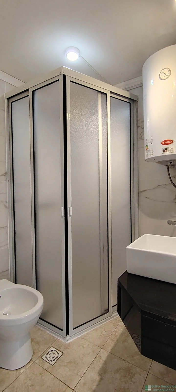 Baño completo con mampara, calefon de 60 litros y extractor de aire.
